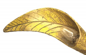 American Rustic Country style (circa 1920s) yellow painted metal floor lamp with 11 leaves having 3 lights emanating from a twisted iron frame resting on a 3 leg base..