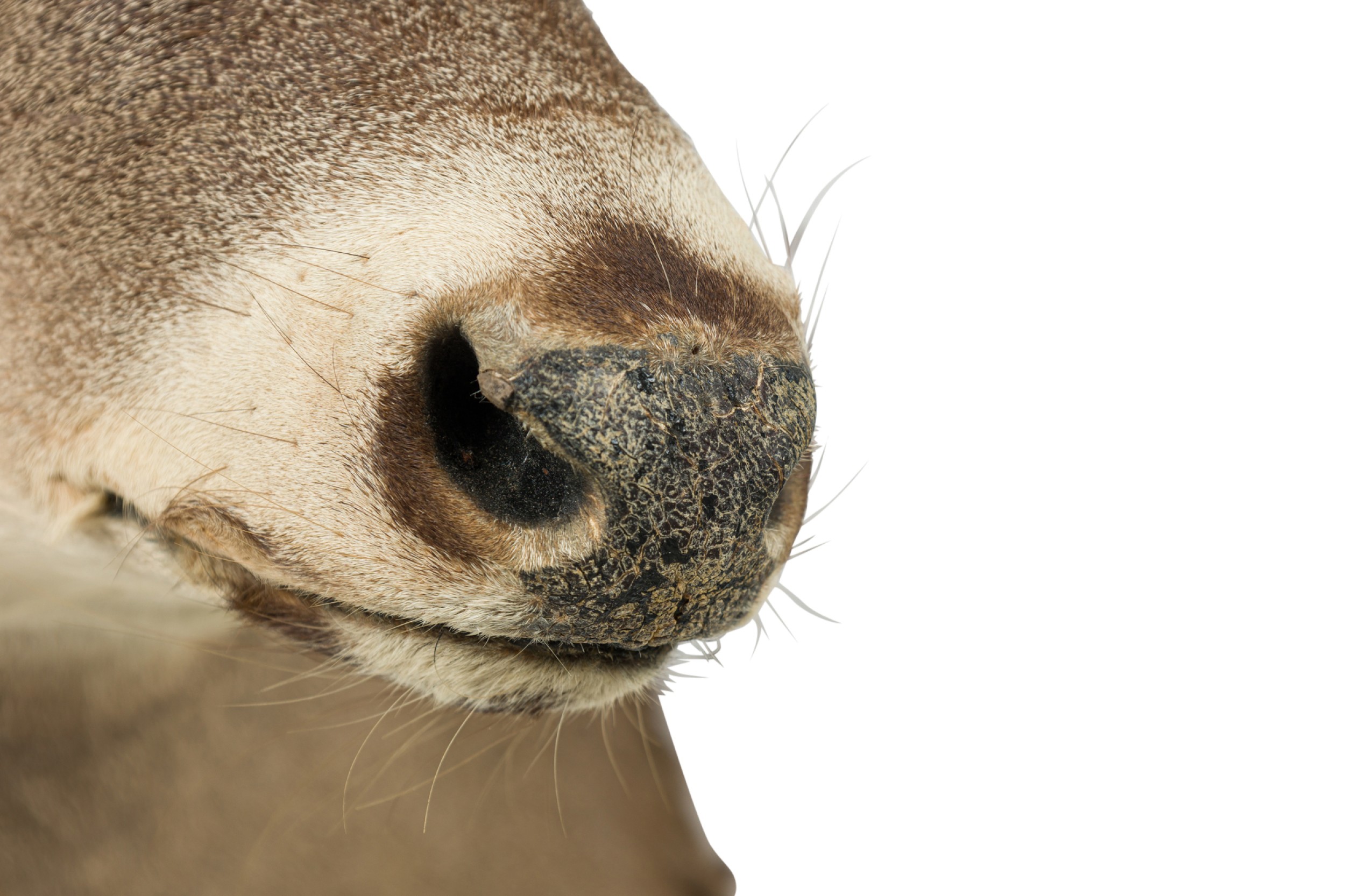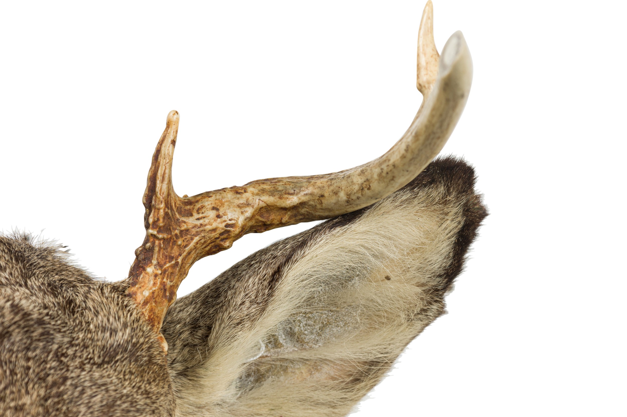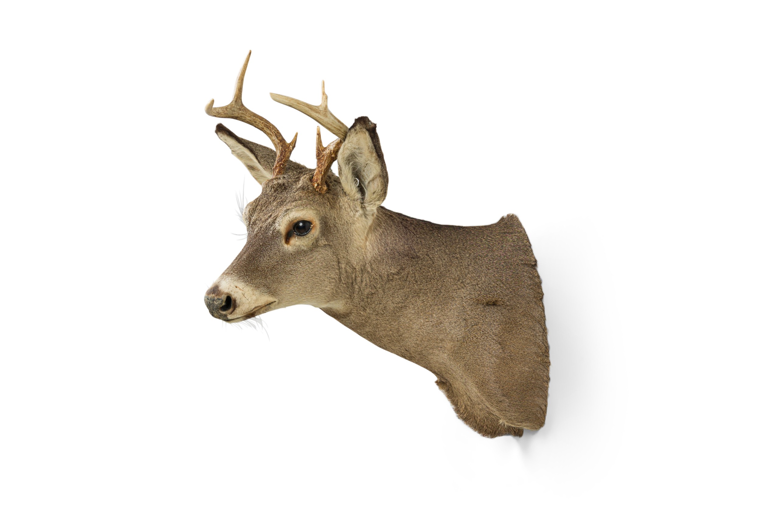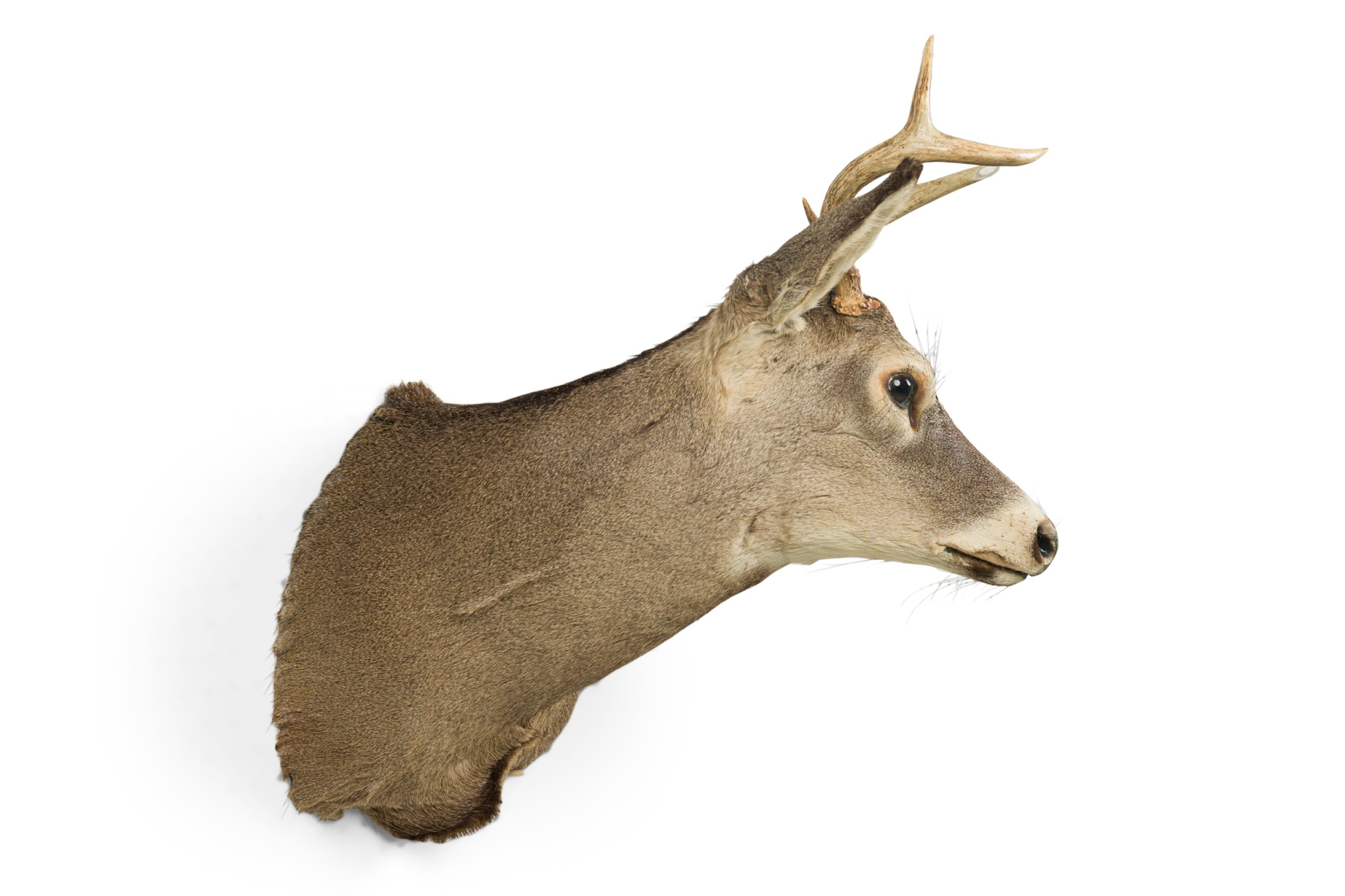 American Rustic Taxidermied of a Grey deer head with short antlers.
