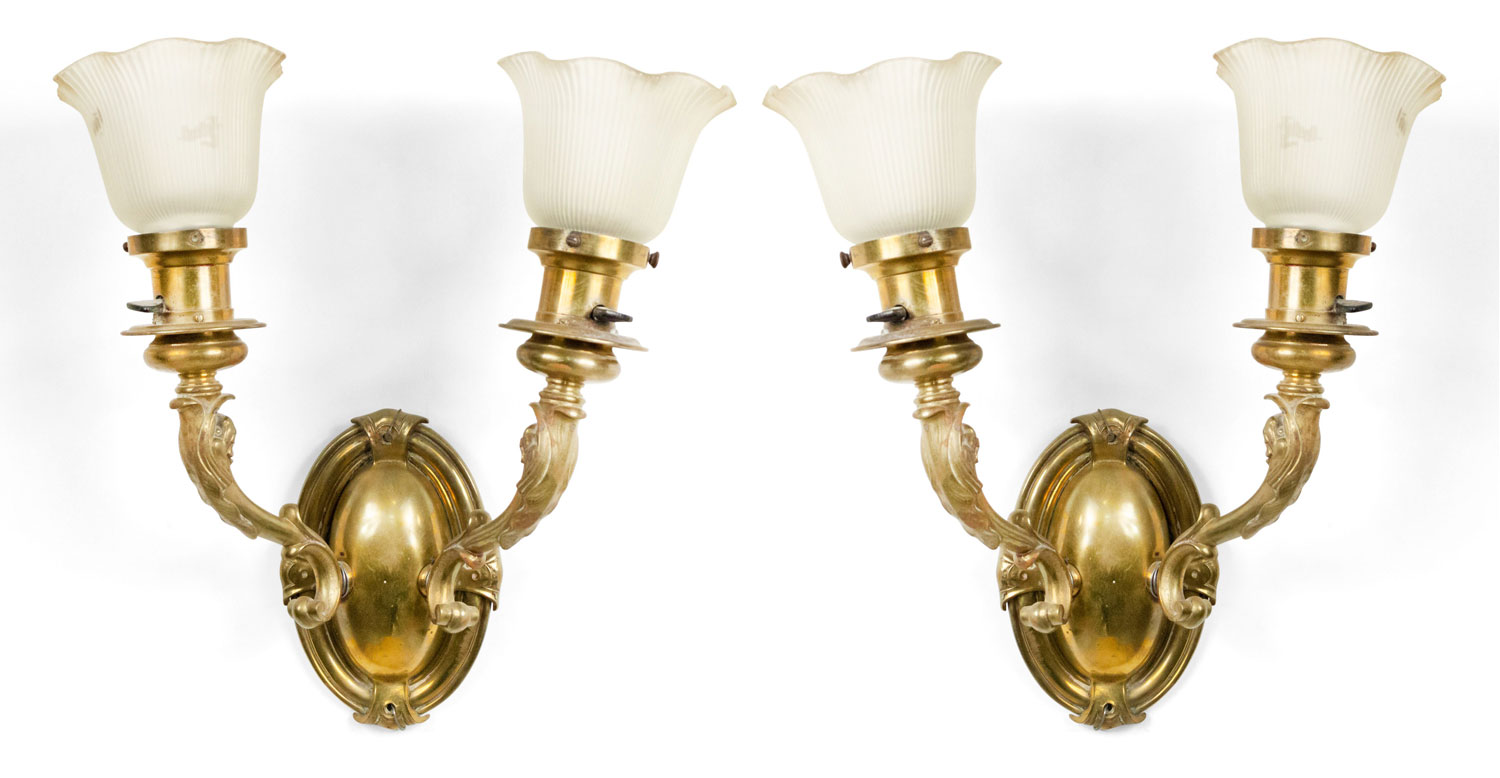 PAIR of American Victorian bronze wall sconces with two dolphin arms and etched glass shades. (PRICED AS PAIR)