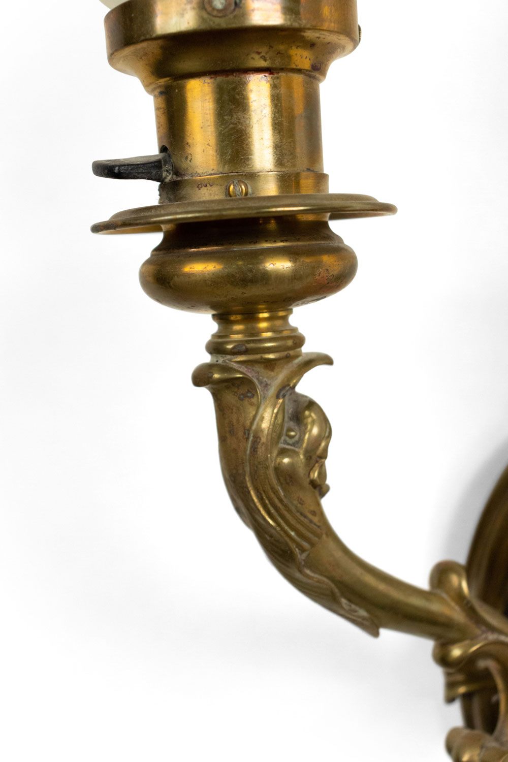 PAIR of American Victorian bronze wall sconces with two dolphin arms and etched glass shades. (PRICED AS PAIR).