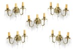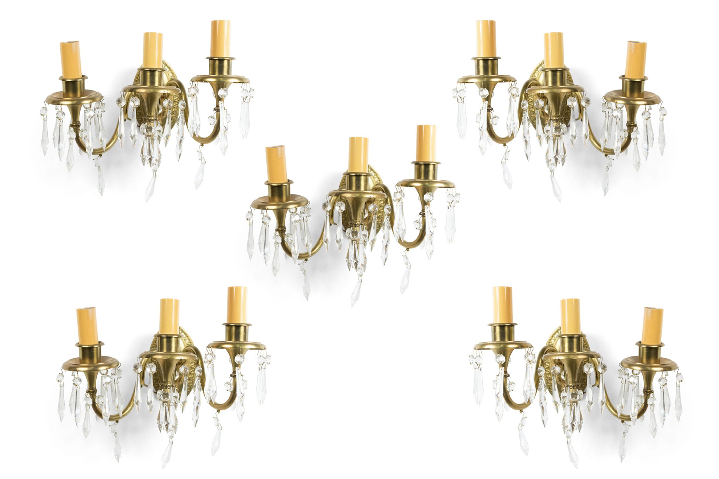 5 American Victorian-style (20th Century) bronze wall sconces with three scrolling arms hung with crystal drops and oval backs. (signed: STERLING BRONZE CO. NEW YORK) (PRICED EACH).