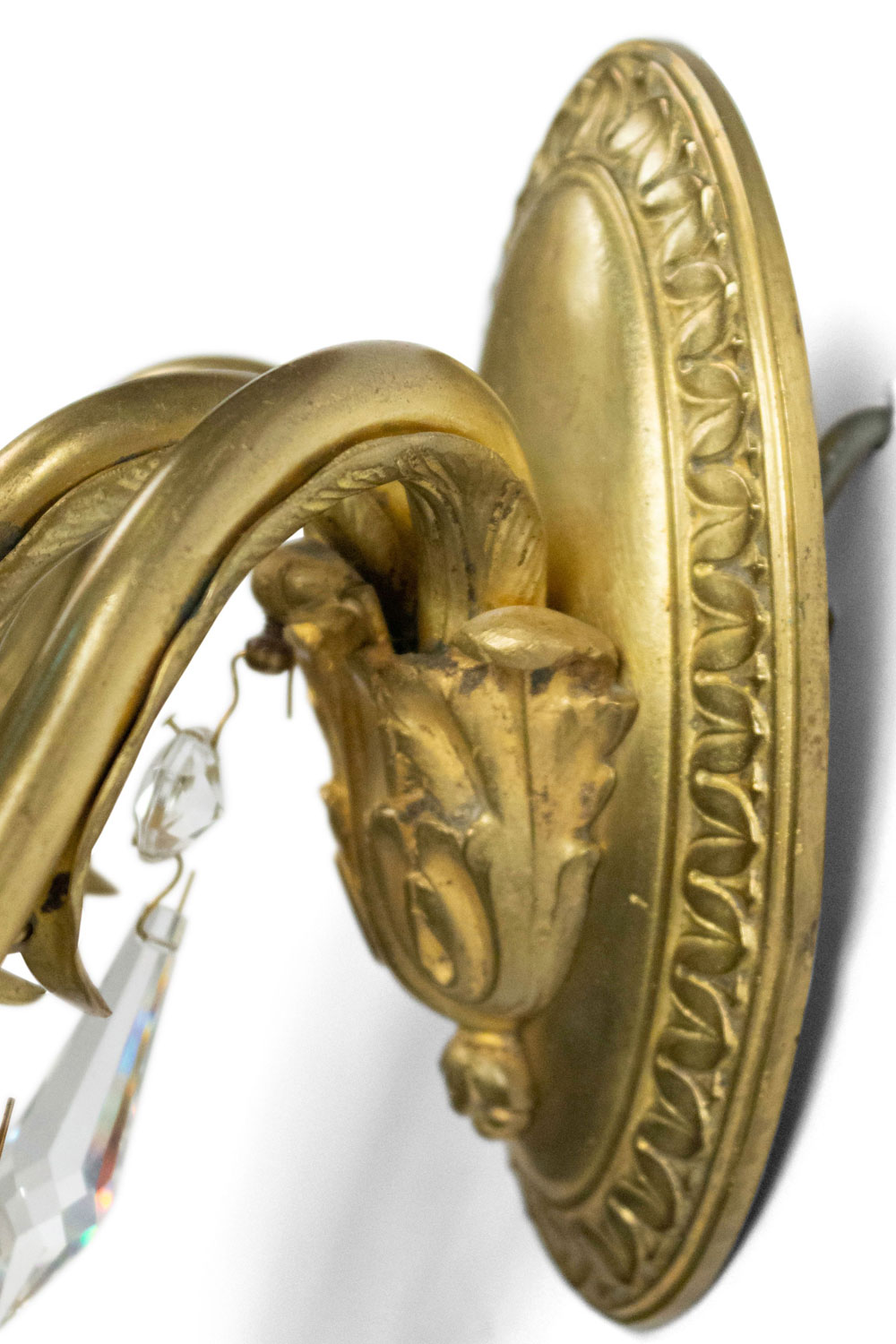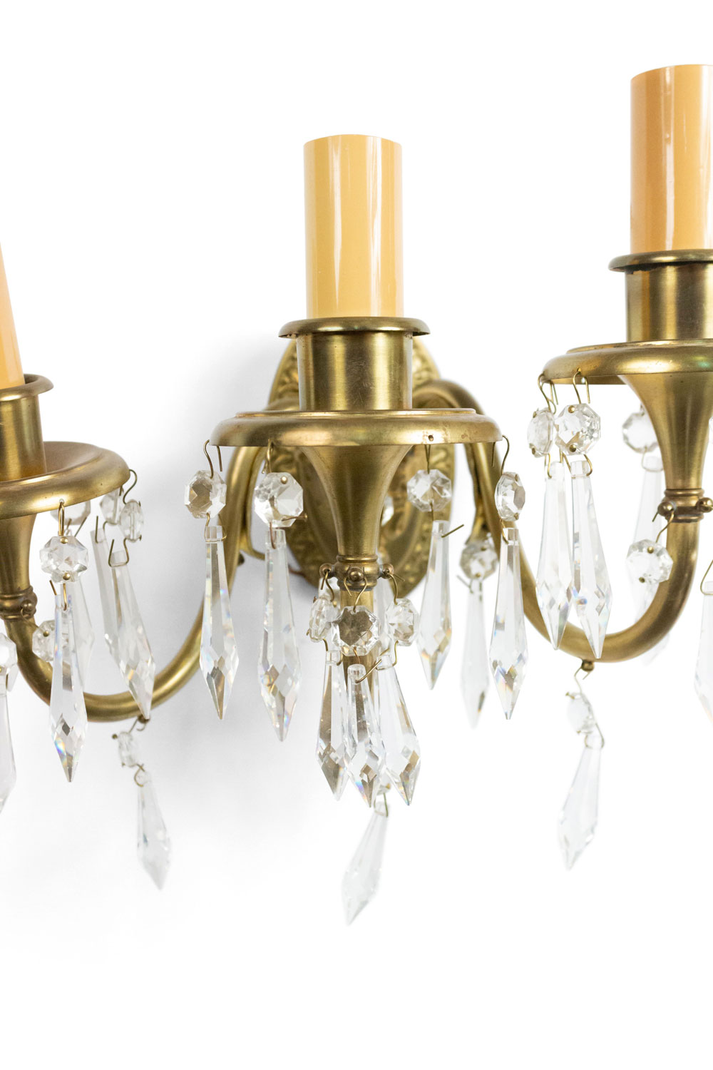 5 American Victorian-style (20th Century) bronze wall sconces with three scrolling arms hung with crystal drops and oval backs. (signed: STERLING BRONZE CO. NEW YORK) (PRICED EACH)