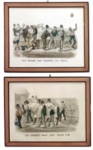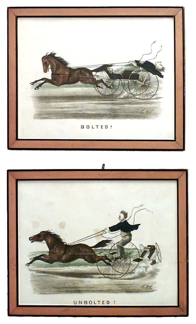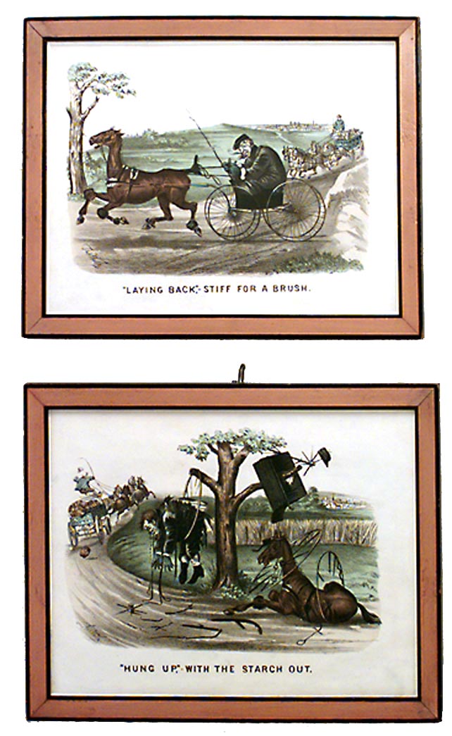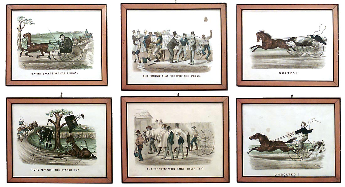 SET of 6 American Victorian maple framed 19th Century colored lithographs of figures with horses and sulkys (signed THOS. WORTH)