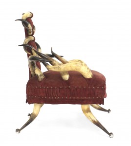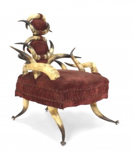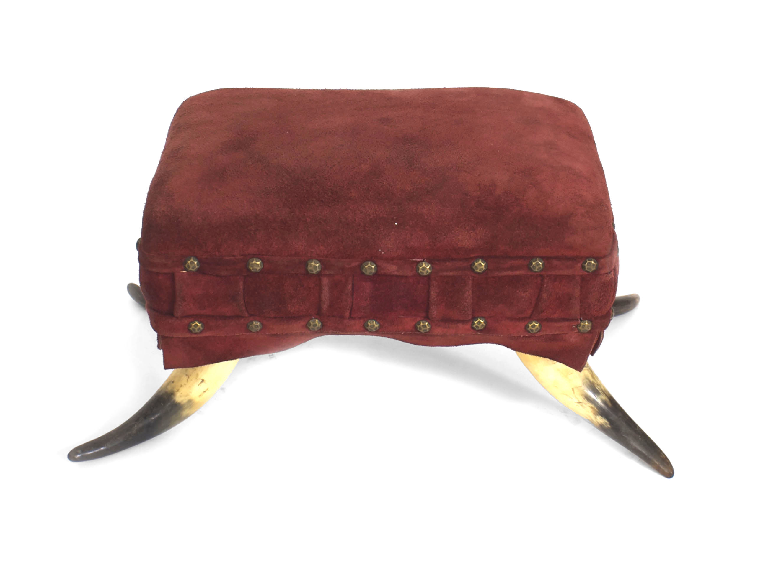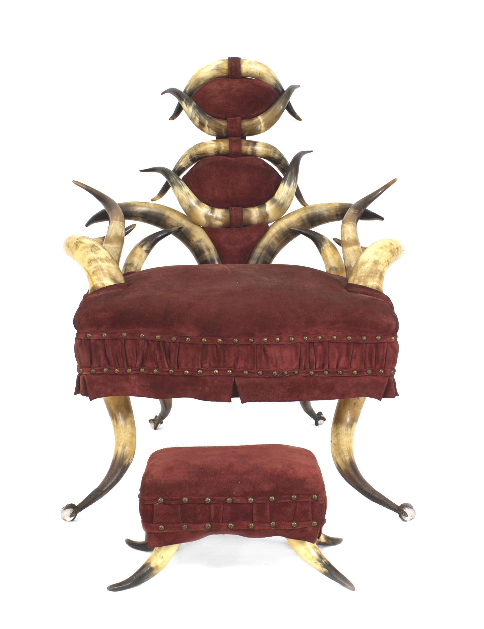 American Victorian steer horn arm chair with maroon velvet upholstered seat & back and metal claw feet holding crystal balls. Includes matching foot stool 17"w x 9.5"d x 8.5"h.