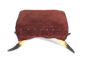 American Victorian steer horn arm chair with maroon velvet upholstered seat & back and metal claw feet holding crystal balls. Includes matching foot stool 17"w x 9.5"d x 8.5"h