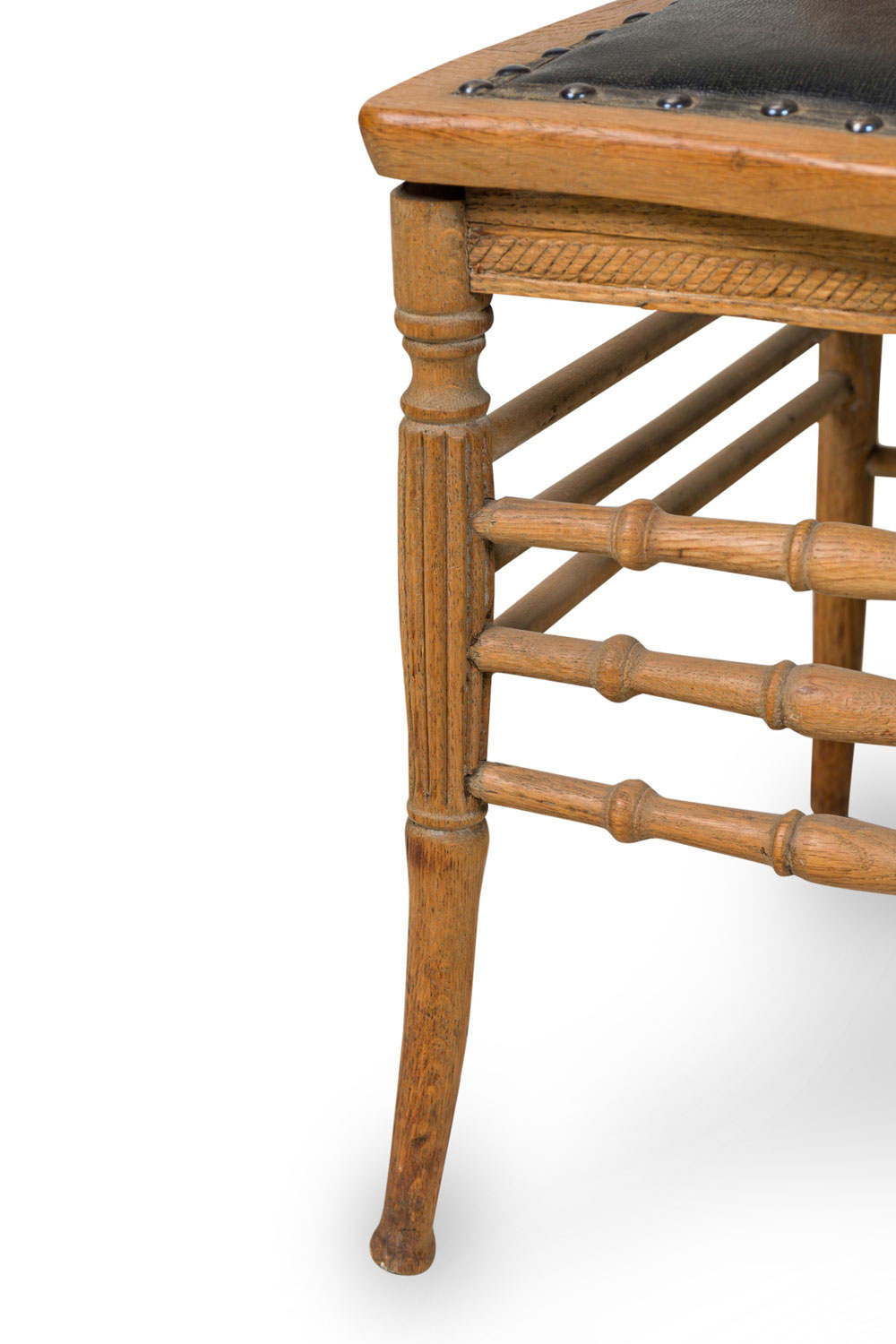 SET of 4 American Victorian stripped oak side chairs with spindle and pressed design back with black leather seat..