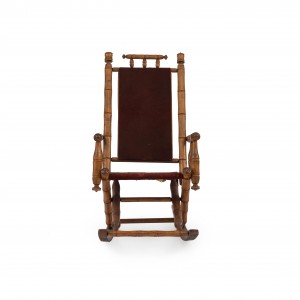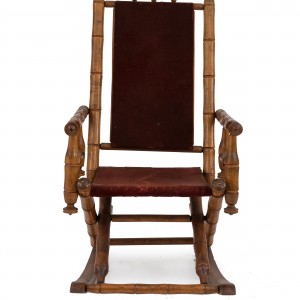 American Victorian faux bamboo maple rocking chair with red velvet paneled back and seat.