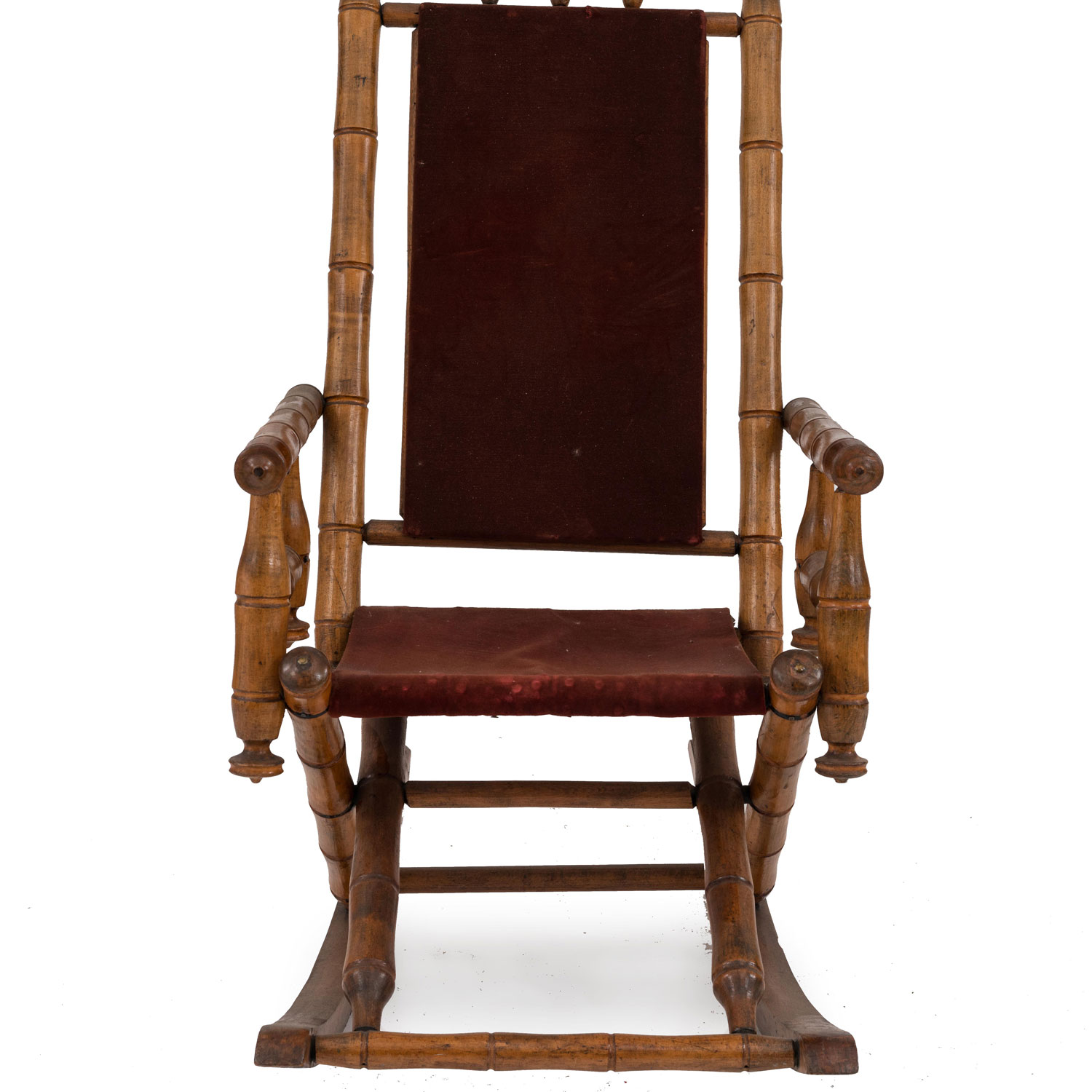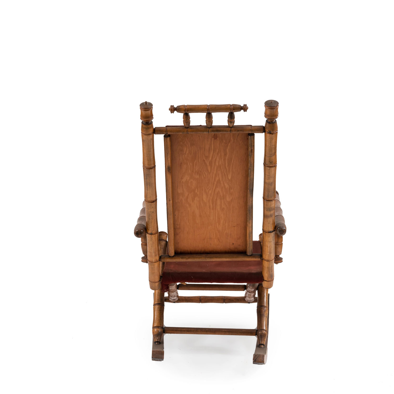 American Victorian faux bamboo maple rocking chair with red velvet paneled back and seat..