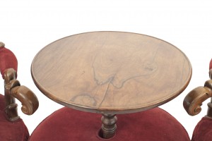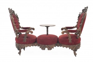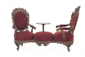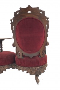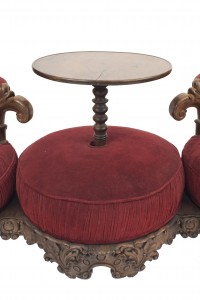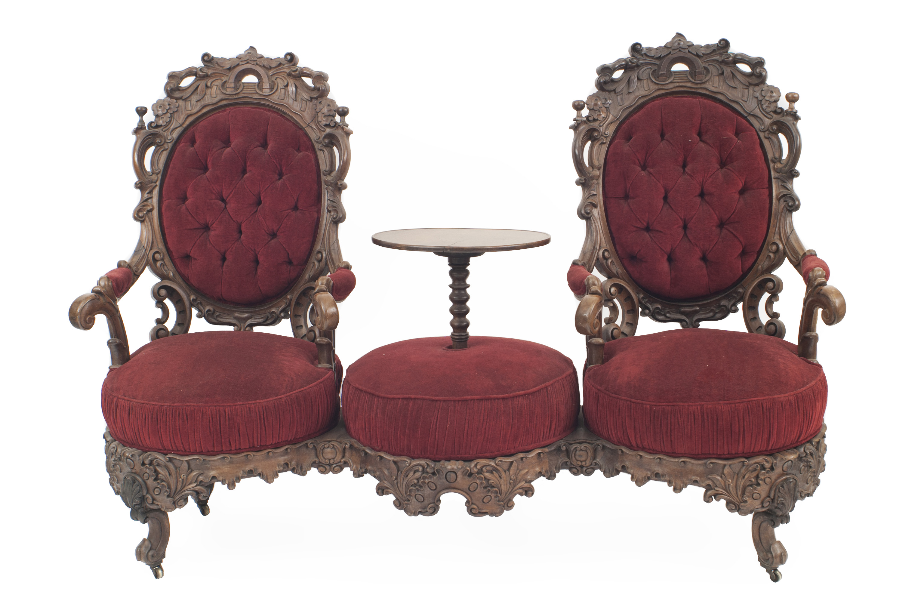 American Victorian rosewood carved double swivel seat tete a tete with table center and red velvet upholstery