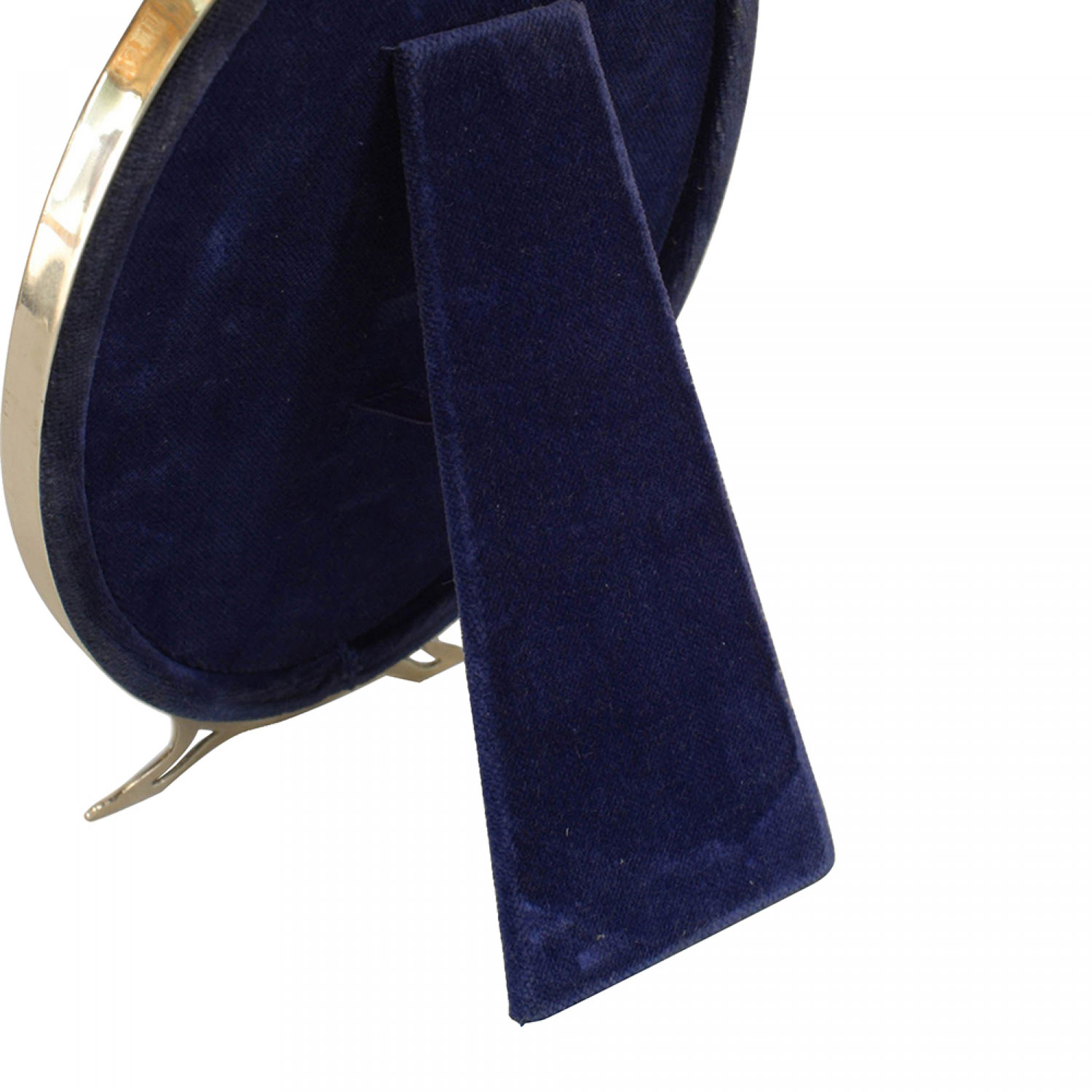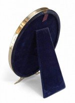 American Victorian-style sterling silver oval easel picture frame raised on 2 open feet with blue velvet backing..