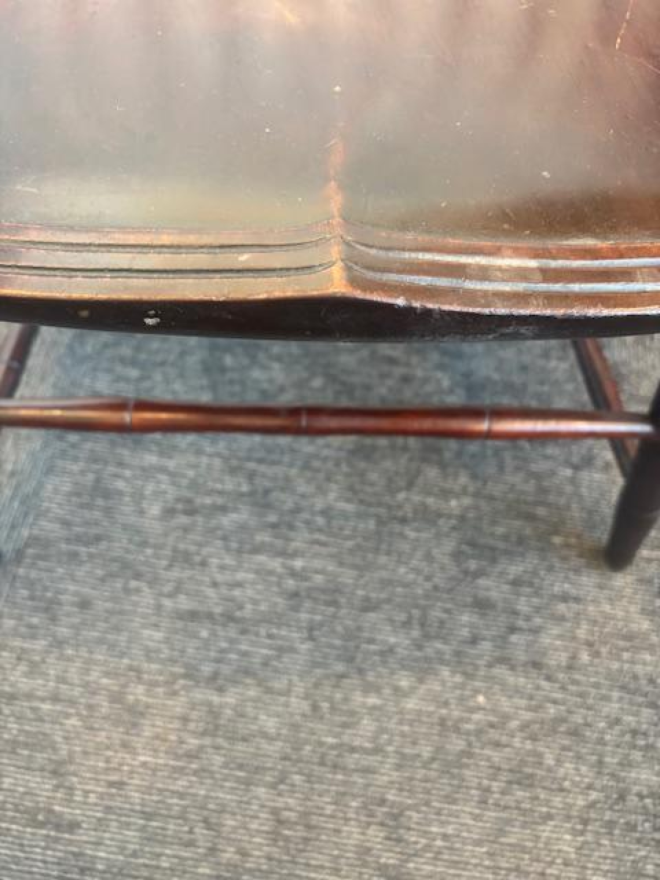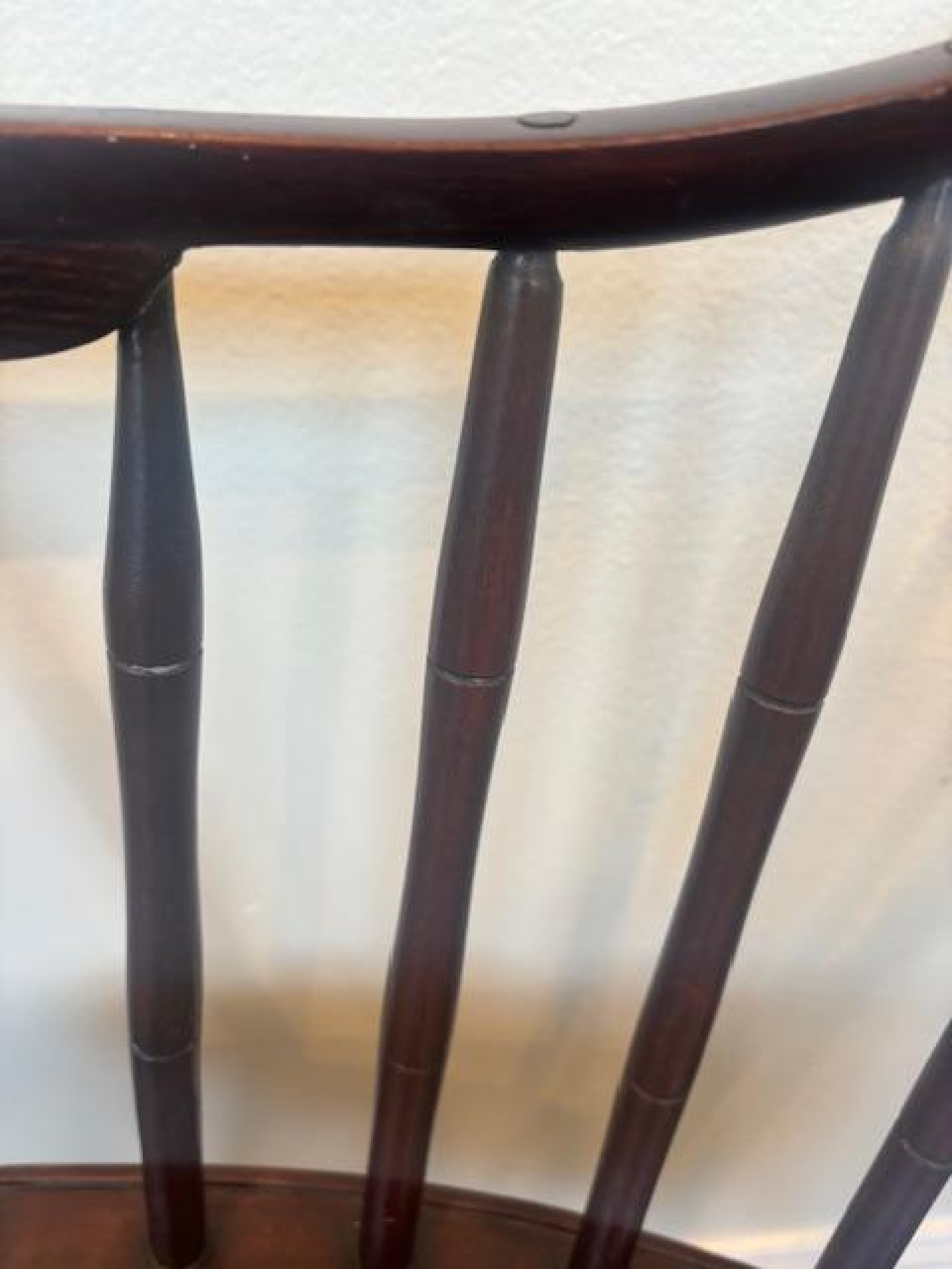 American Windsor style (19th Century) dark stained faux bamboo hoop shaped spindle back armchair ending with a scroll design front and having a shaped seat over a box stretcher