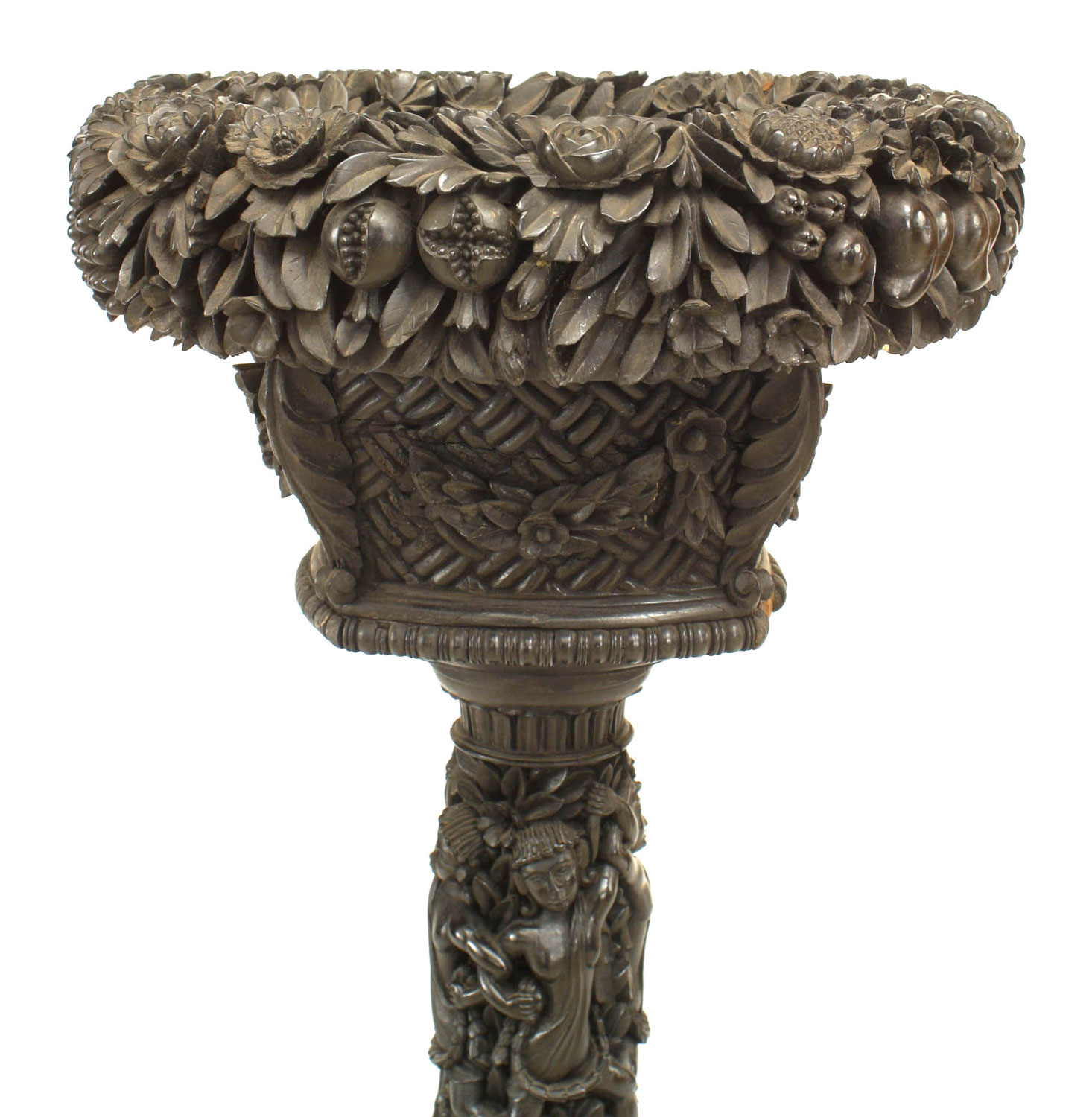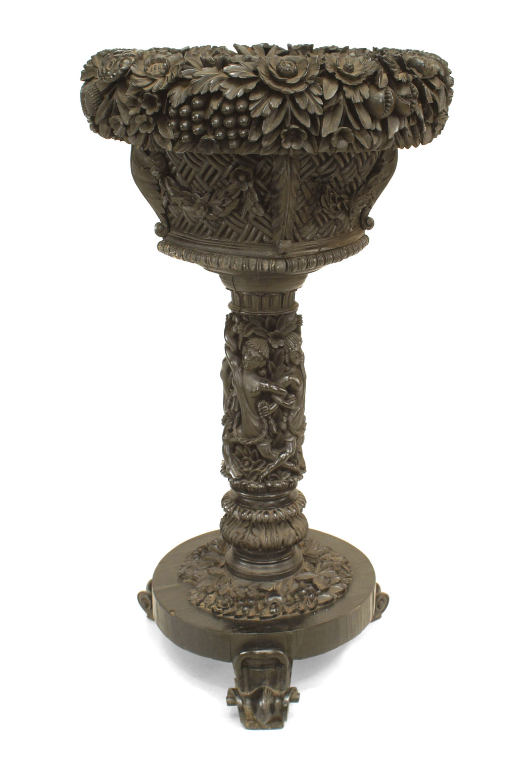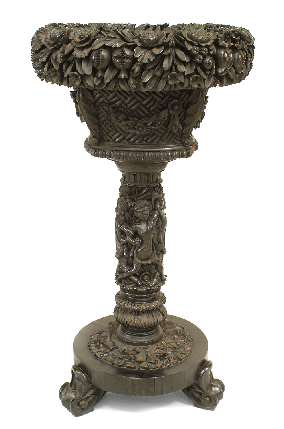 English Anglo Indian floral carved ebony fernery with circular top and pedestal base. (19th Cent)