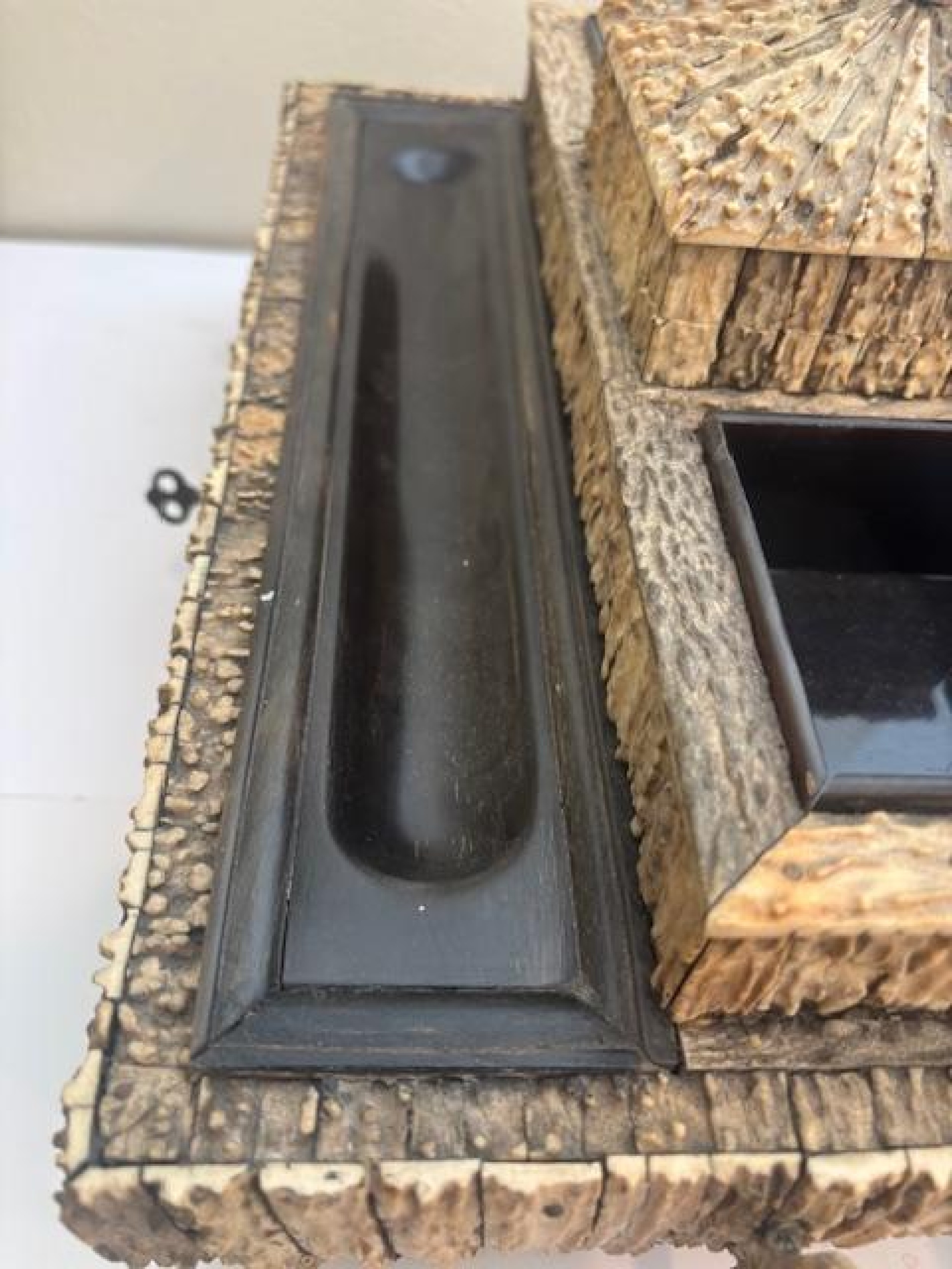 Anglo Indian (19th Century) antler veneered sandalwood writing box of rectangular form with 2 glass inkwells above a drawer (Vizigapatam)
