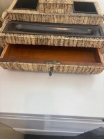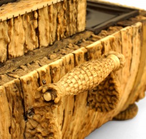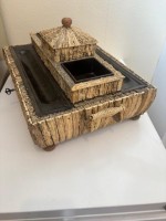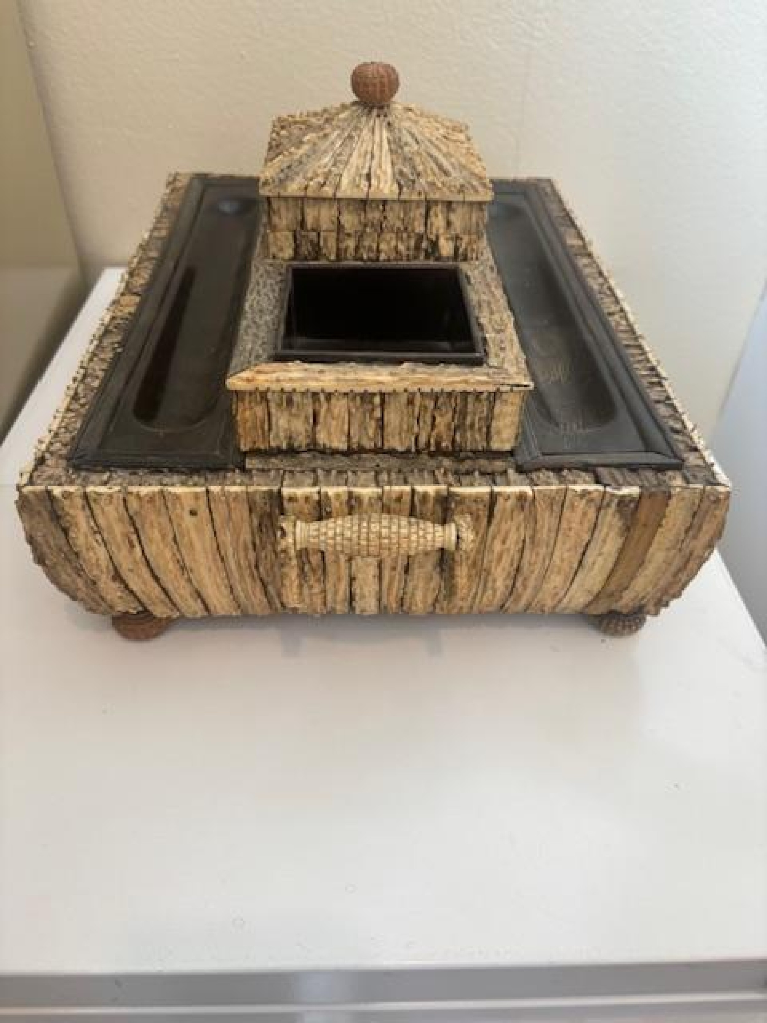 Style: English Materials & Techniques: Horn, veneer, wood Category: Office/Library, Accessories/Décor/Bric-a-Brac Condition: 2 replaced ball feet and finial on box top