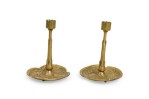 PAIR of Austrian Art Nouveau / Secessionist bronze candlesticks with the relief of whiplash stems emerging from the bobeches upright cradling a candle stick with two lilies (marked: GESCHUTZT) (PRICED AS PAIR).