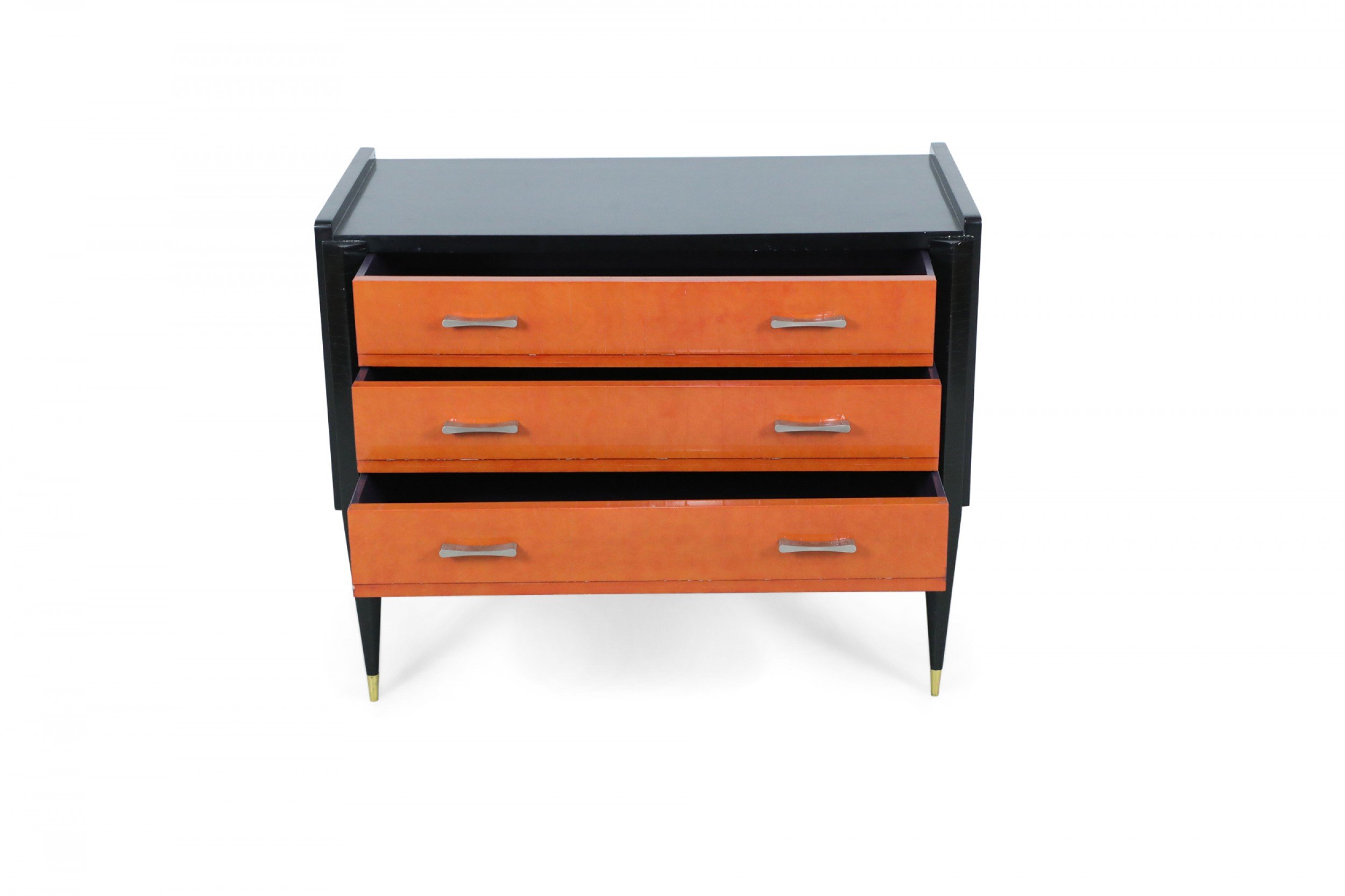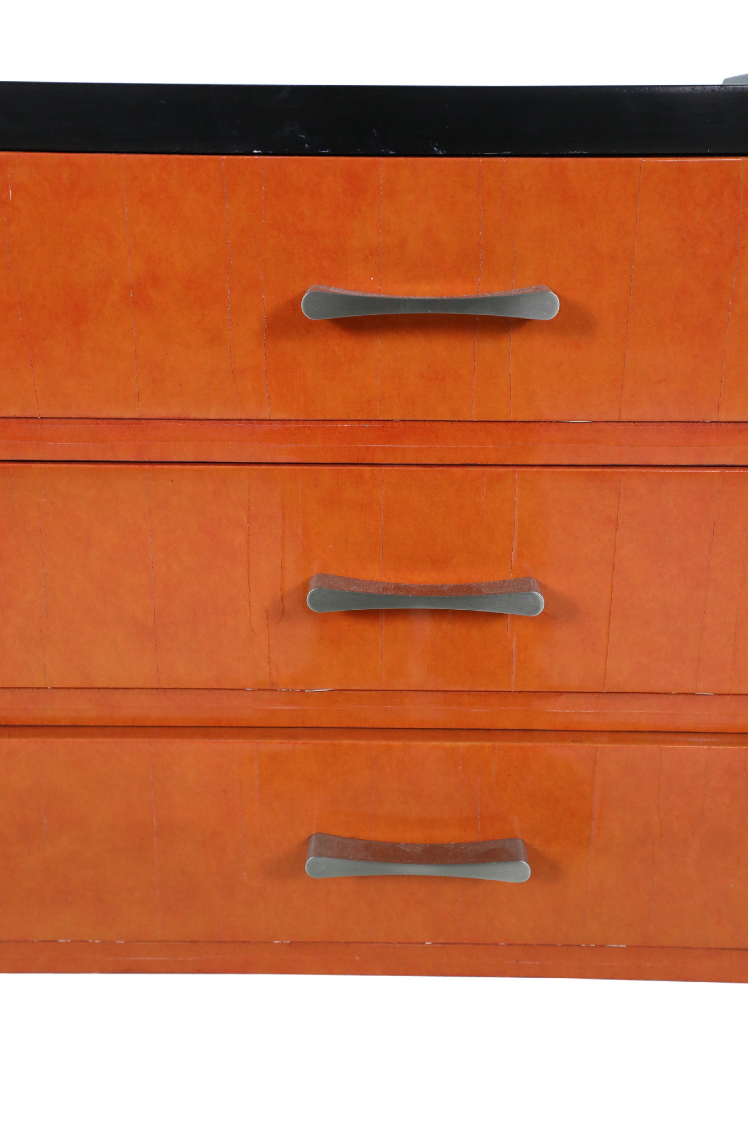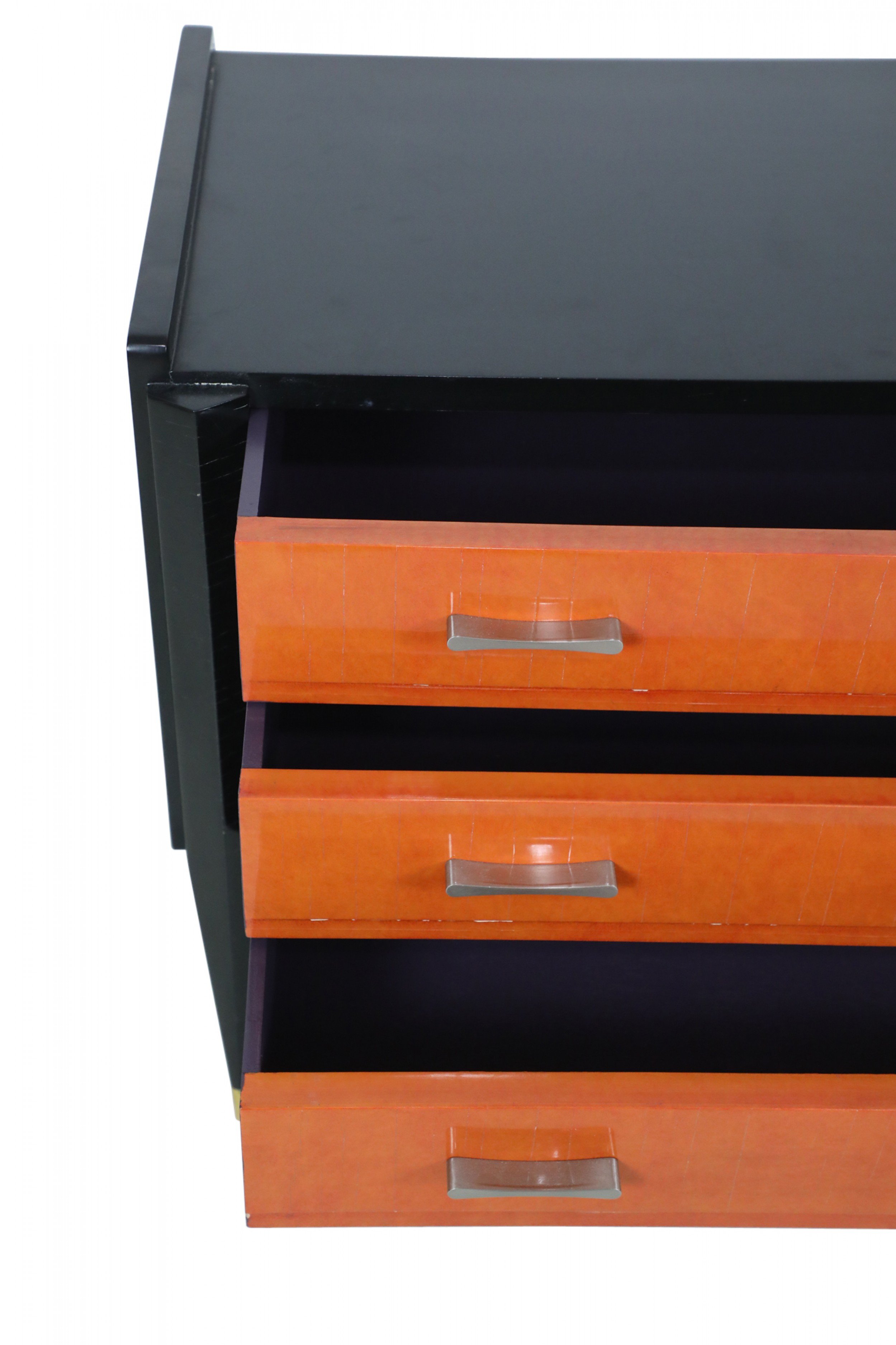 Art Deco style black and orange lacquered 3-drawer chest with beveled front legs and bronze sabots with nickel drawer pulls..