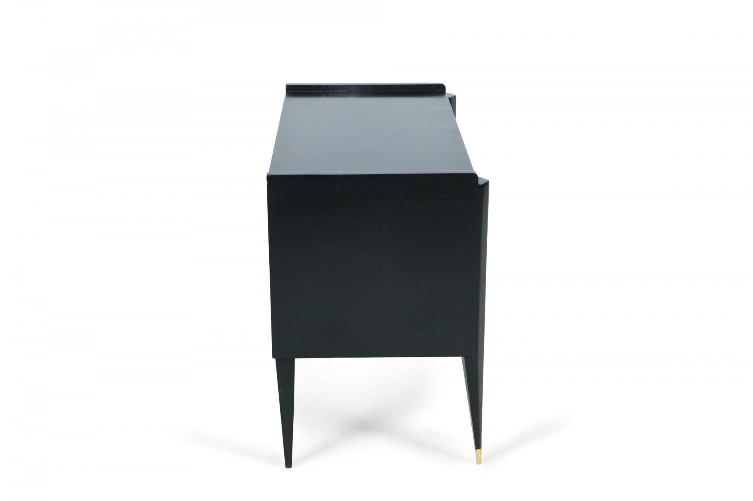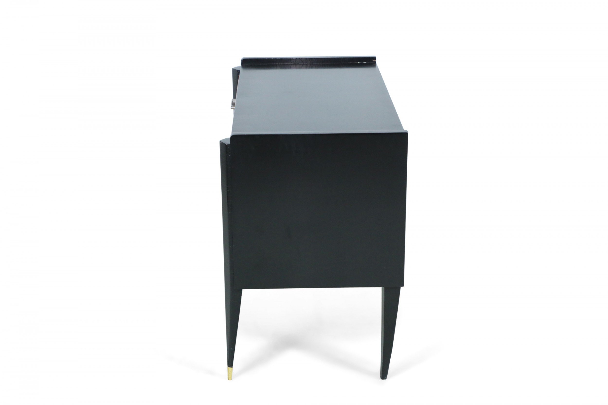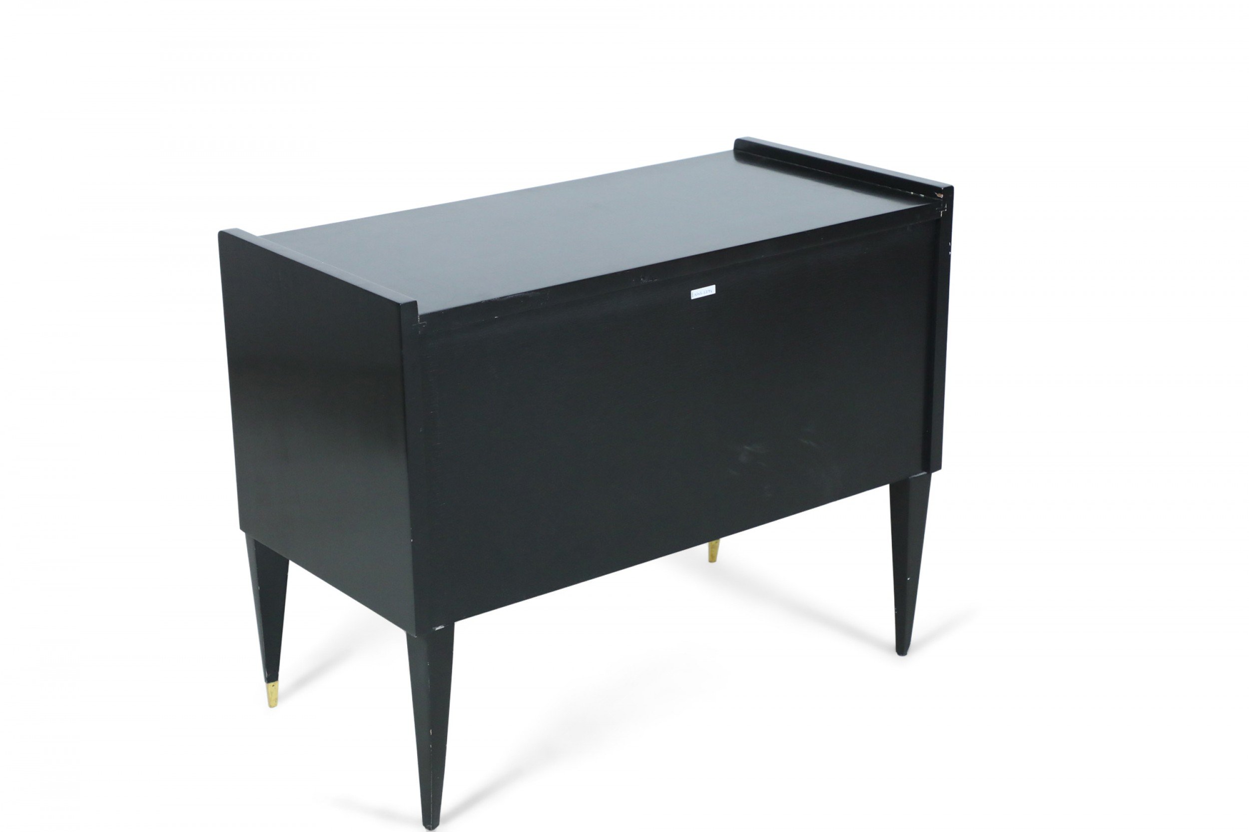 Art Deco style black and orange lacquered 3-drawer chest with beveled front legs and bronze sabots with nickel drawer pulls..