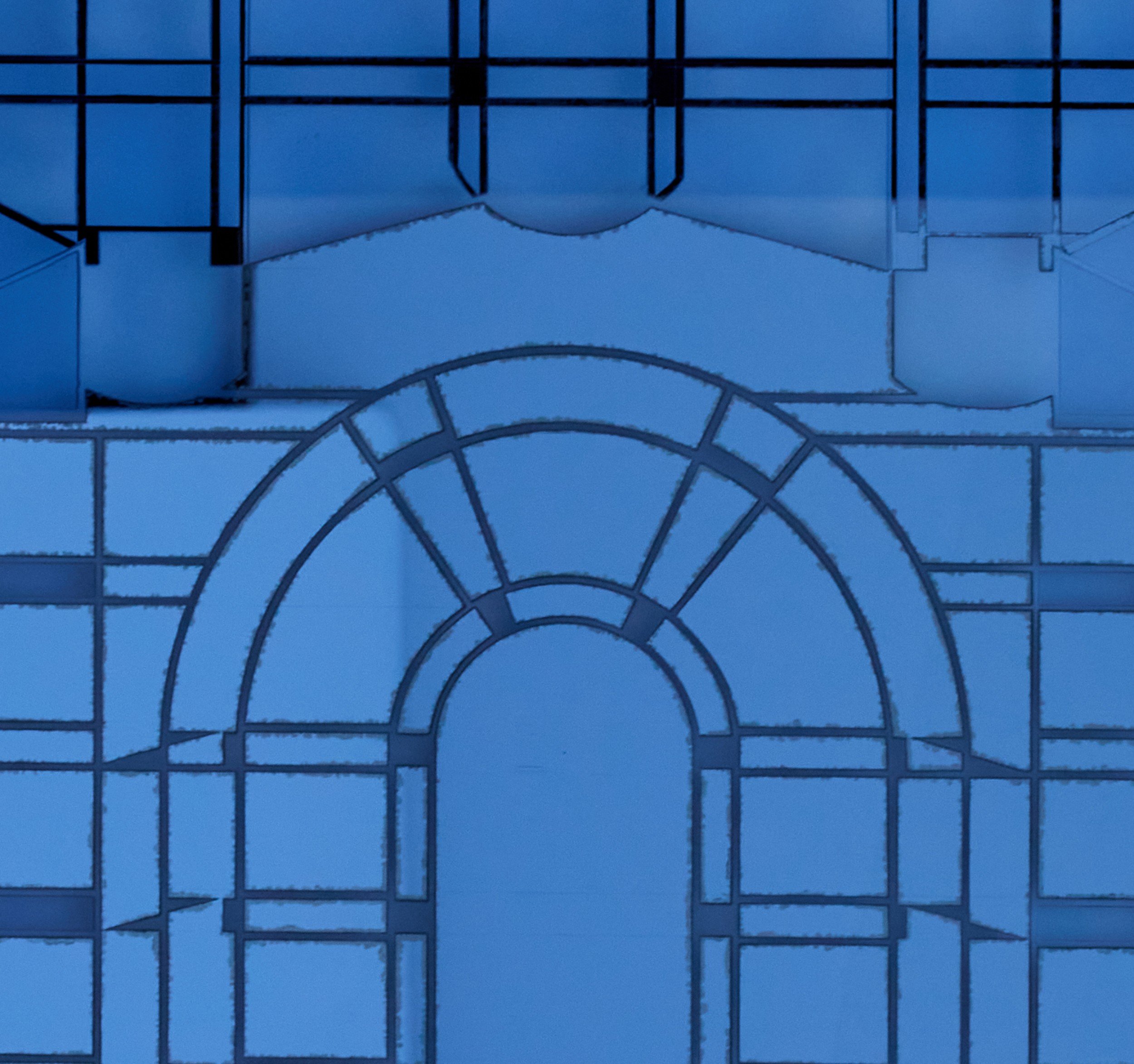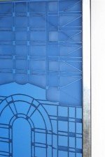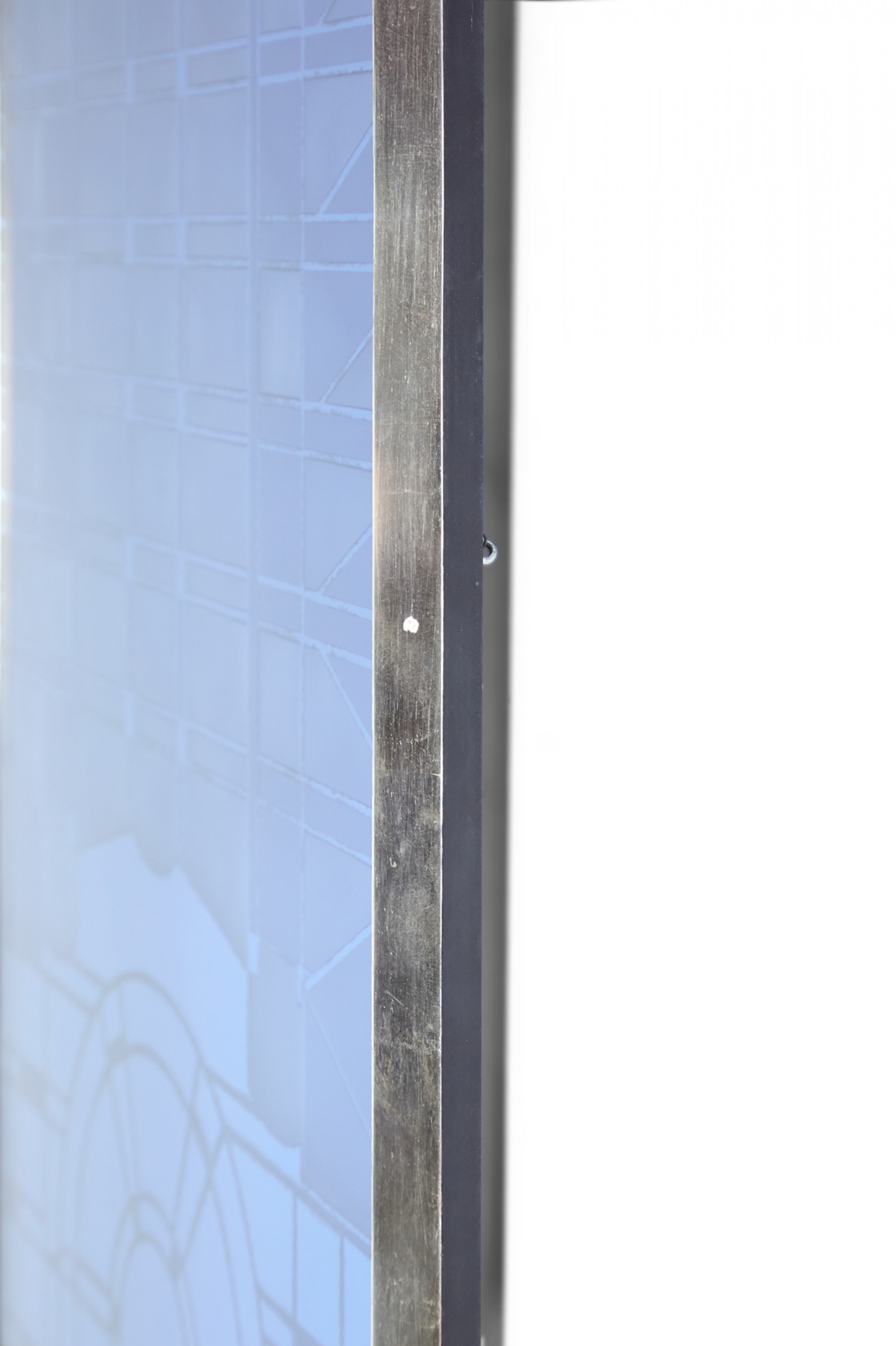 American Art Deco-Style framed glass mirror panel featuring geometric designs in blue and silver in a rectangular silver leaf frame.
