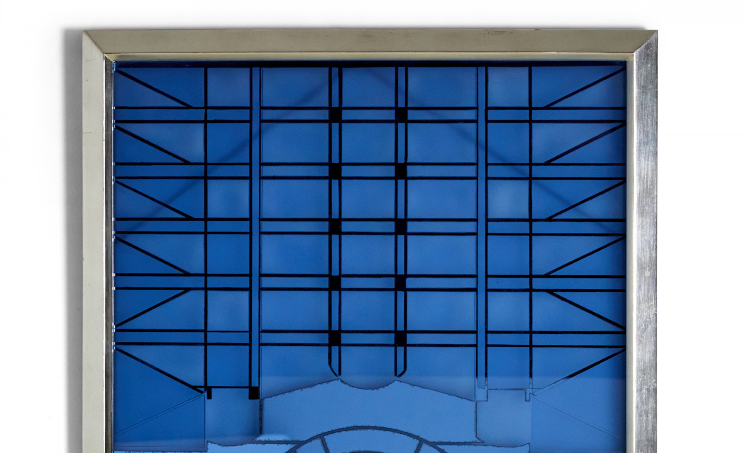 American Art Deco-Style framed glass mirror panel featuring geometric designs in blue and silver in a rectangular silver leaf frame..
