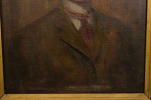 Gilt framed oil painting portrait of man in brown suit and red tie.