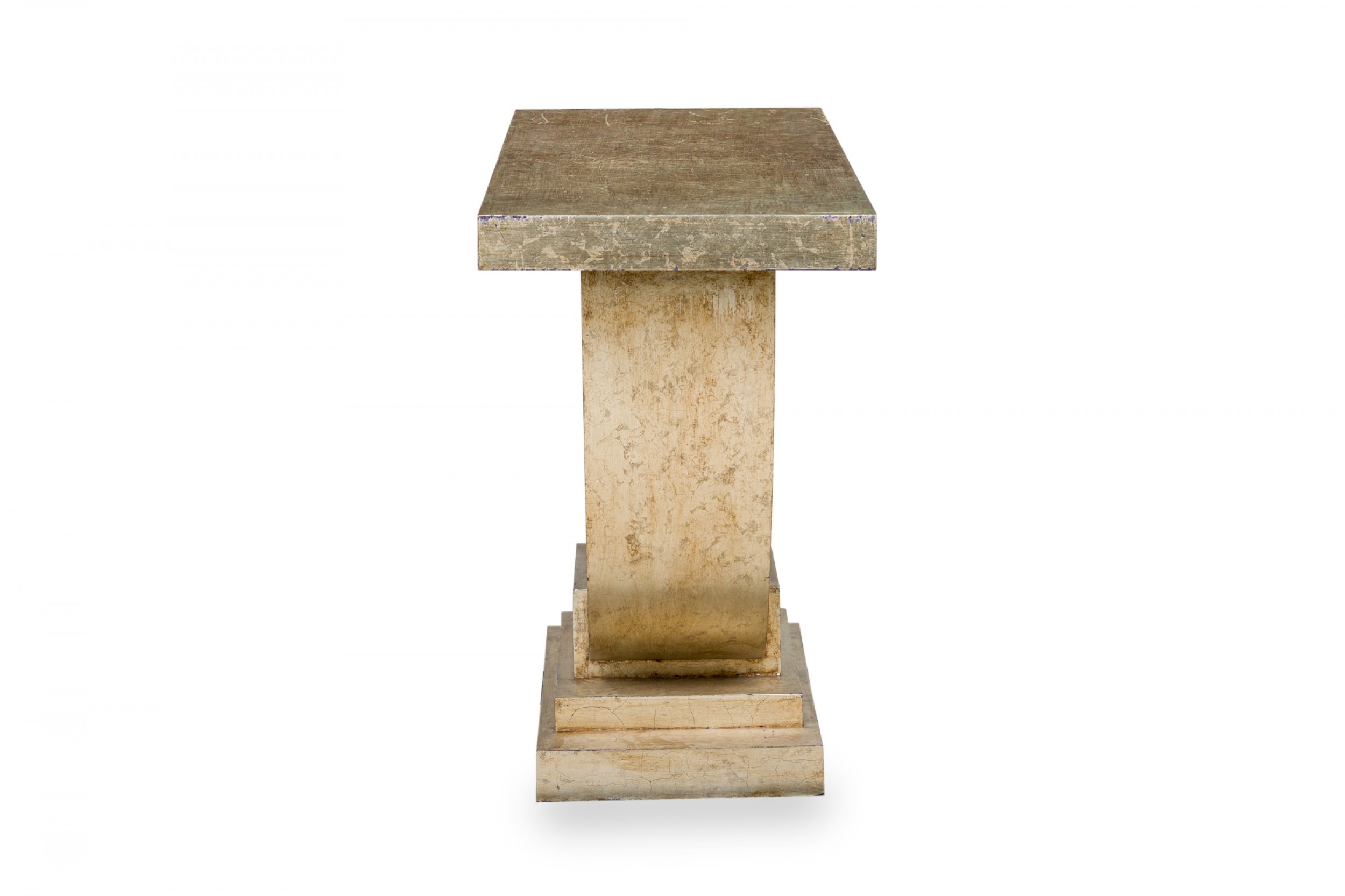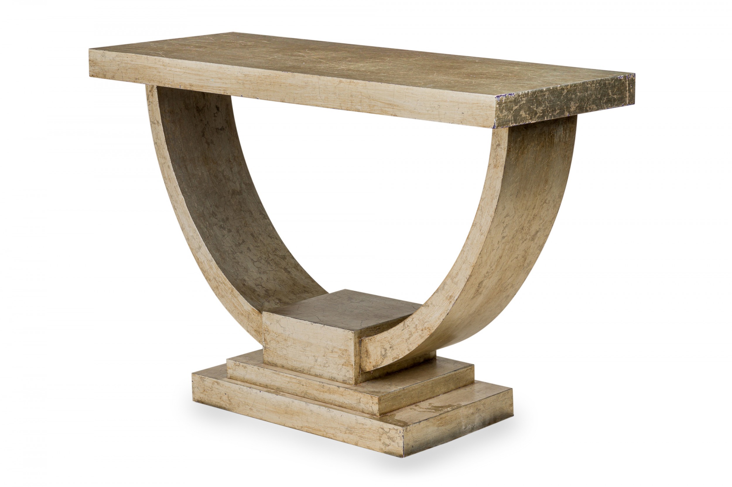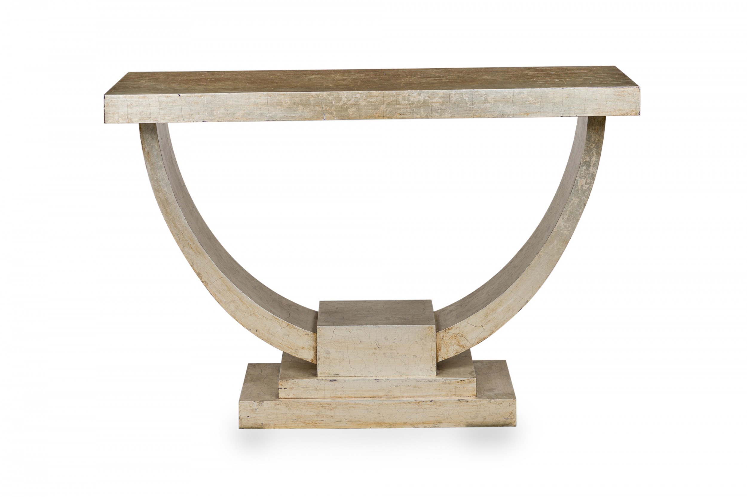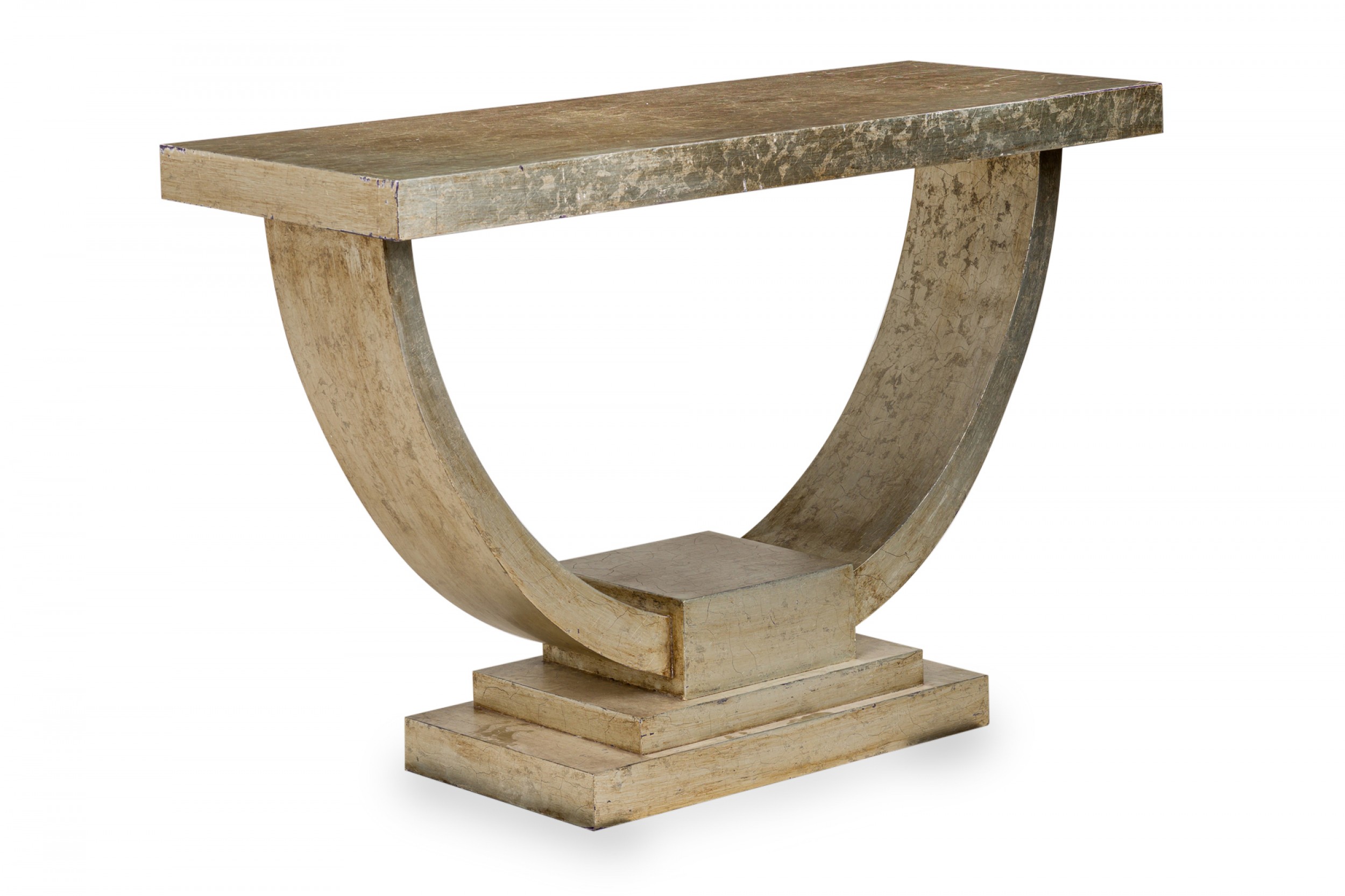 Art Deco-style rectangular wooden console table with curved supports anchored in a rectangular stepped base, finished in a crackled gilded silver.