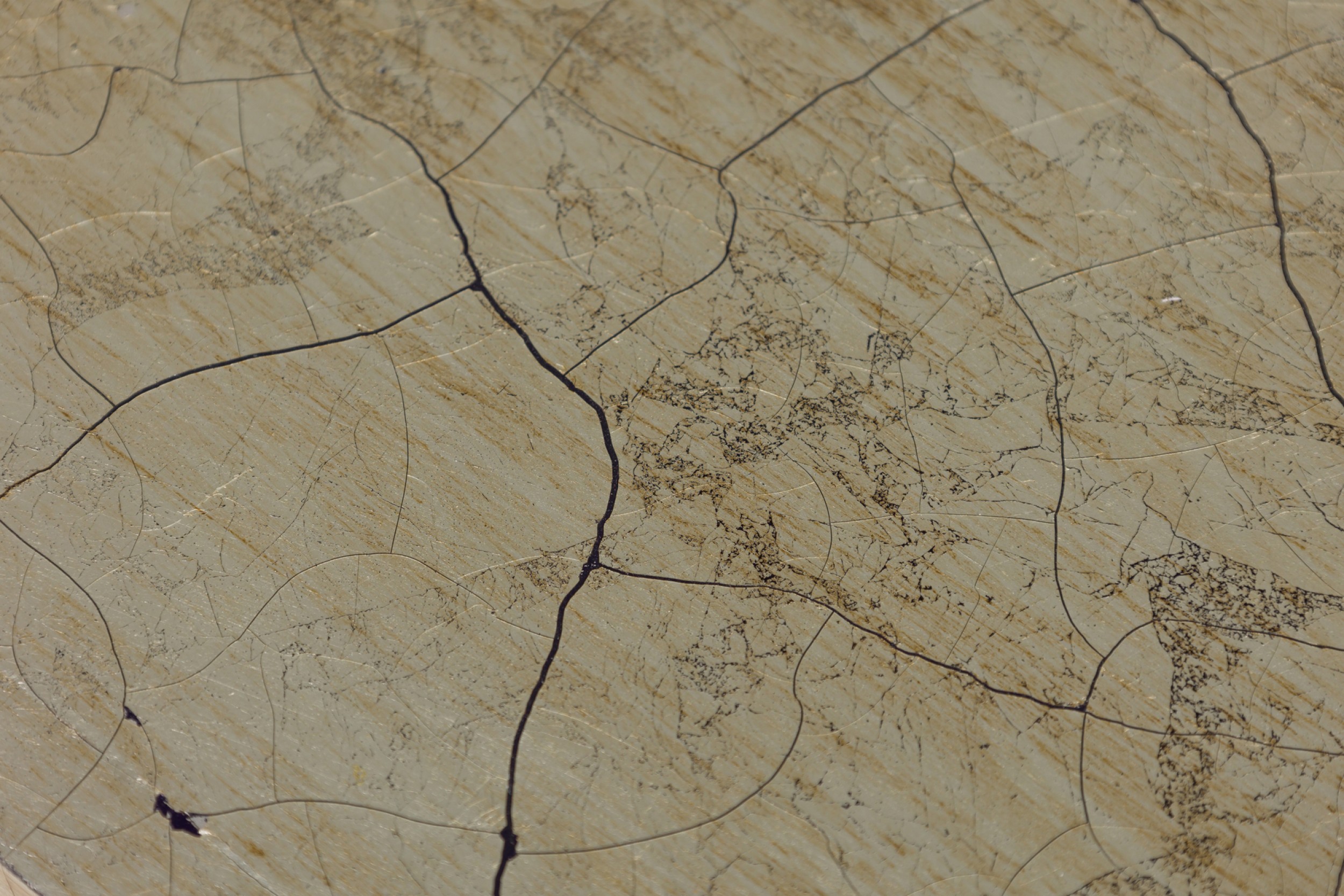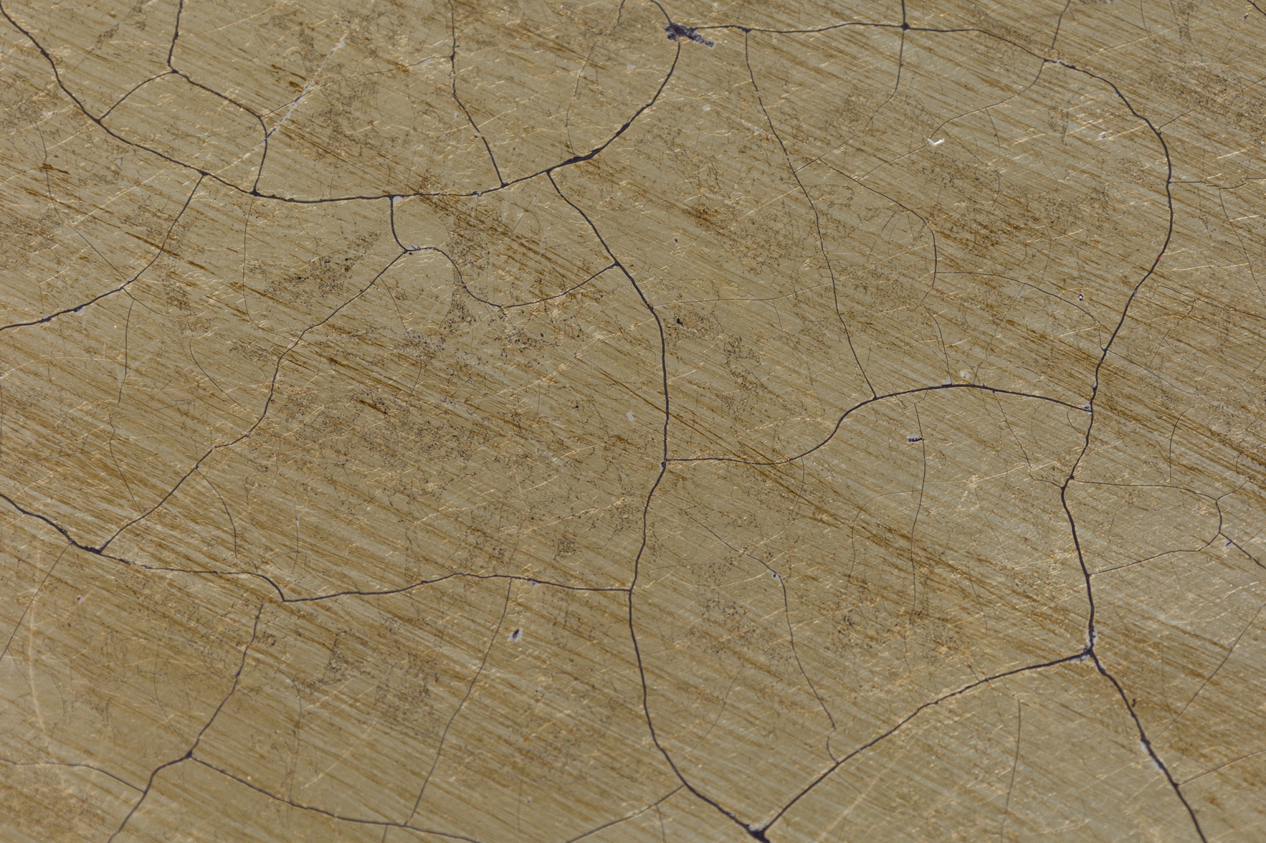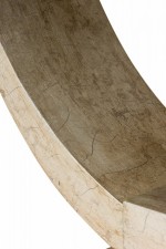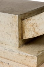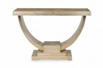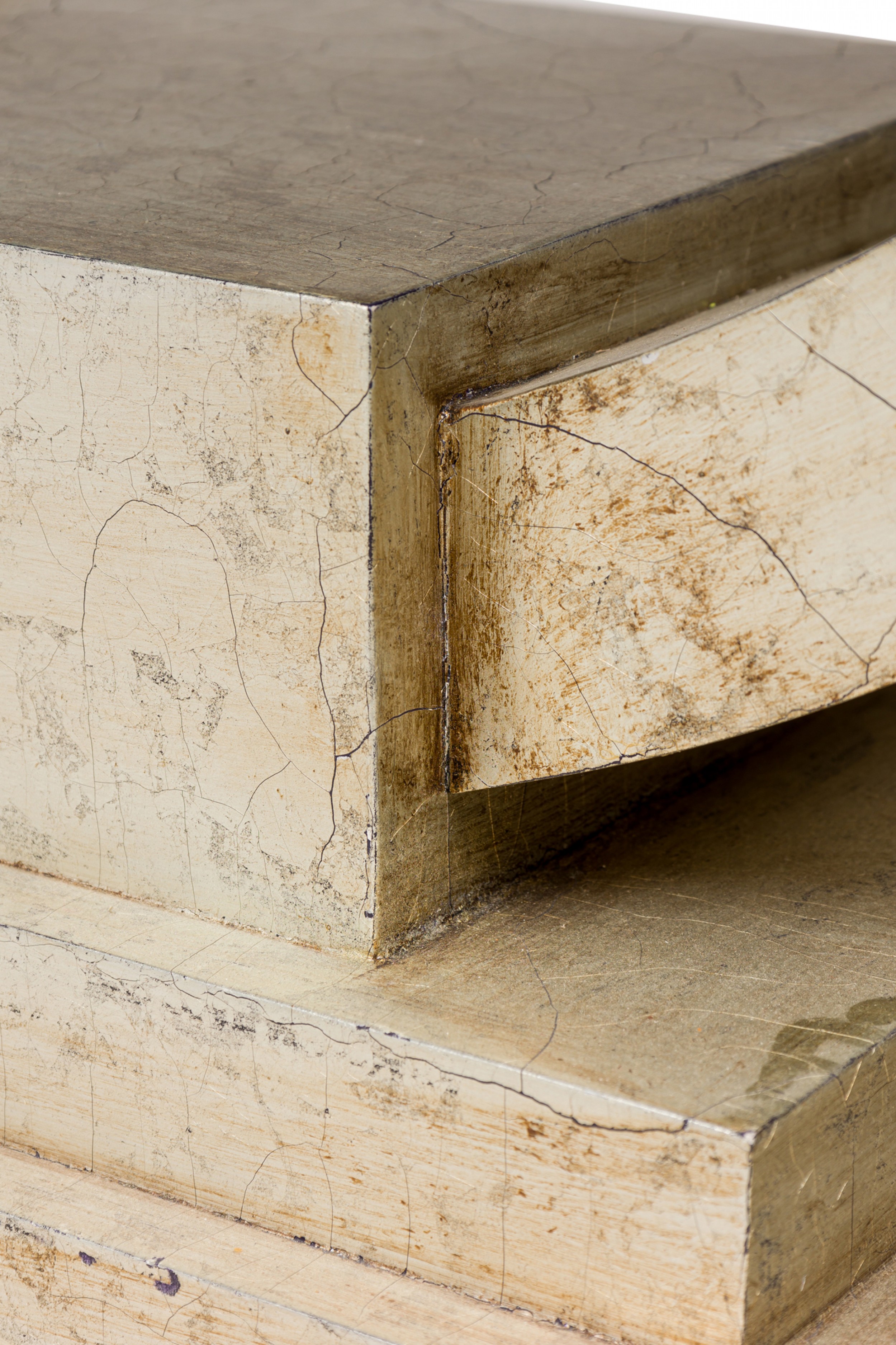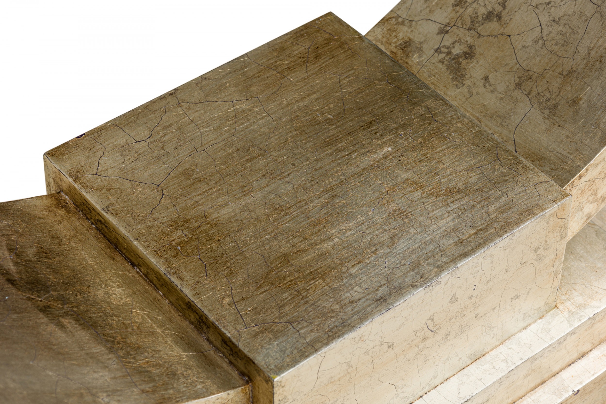 Art Deco-style rectangular wooden console table with curved supports anchored in a rectangular stepped base, finished in a crackled gilded silver.