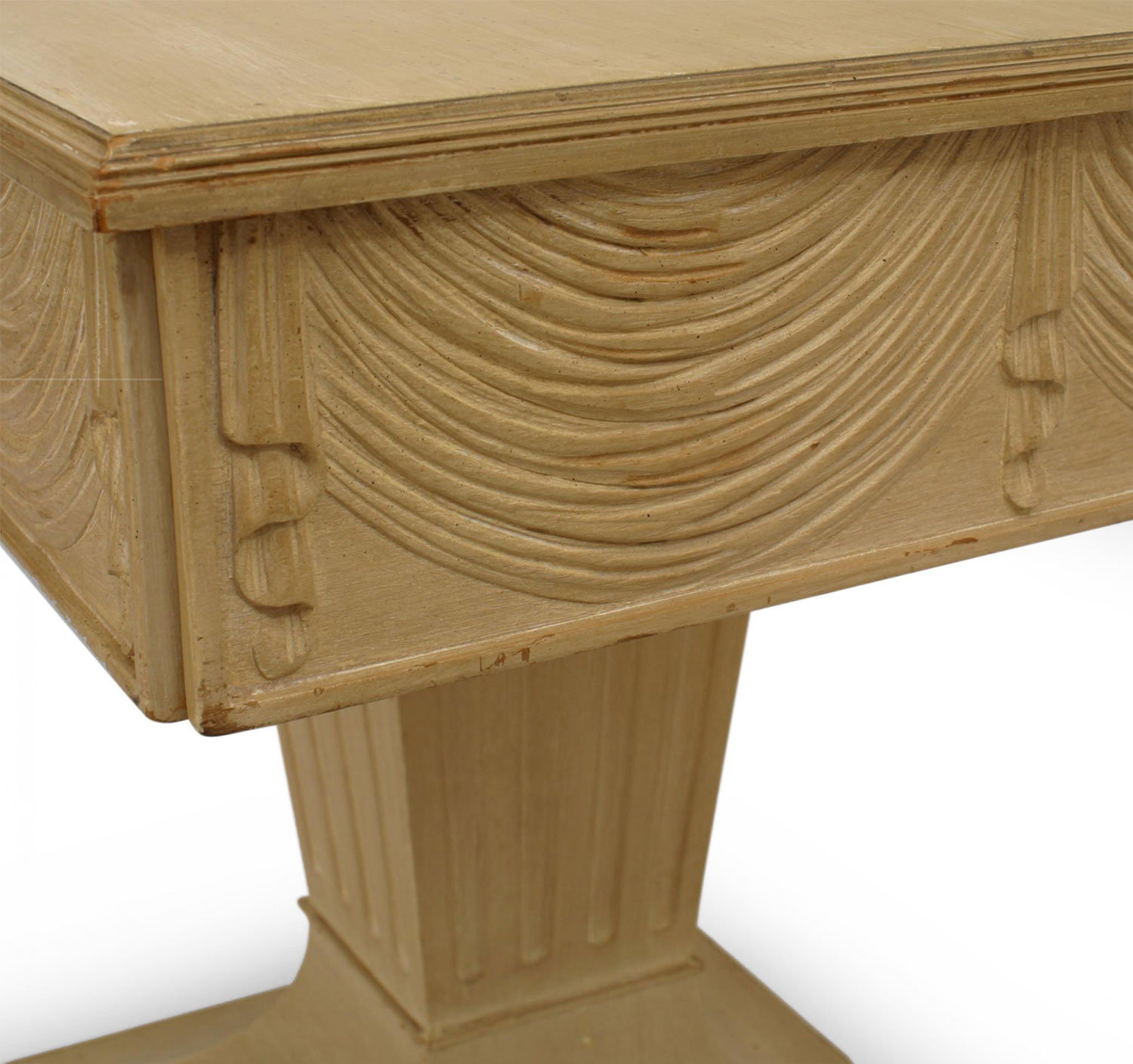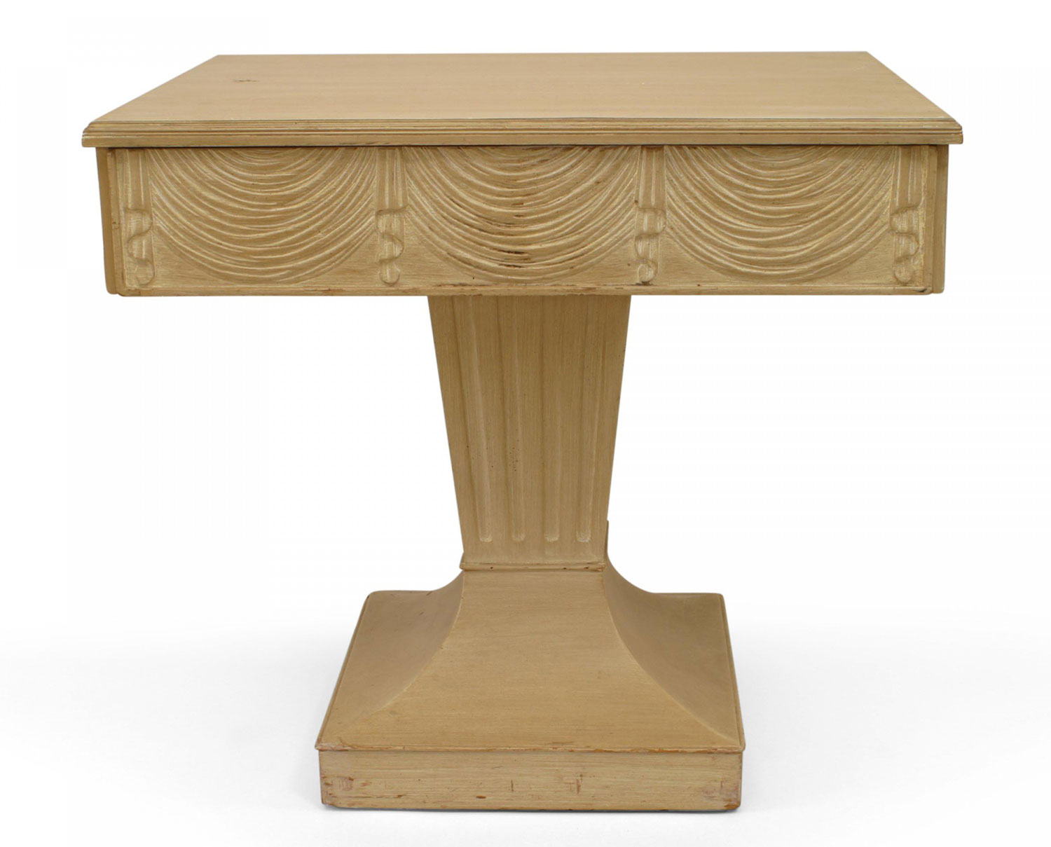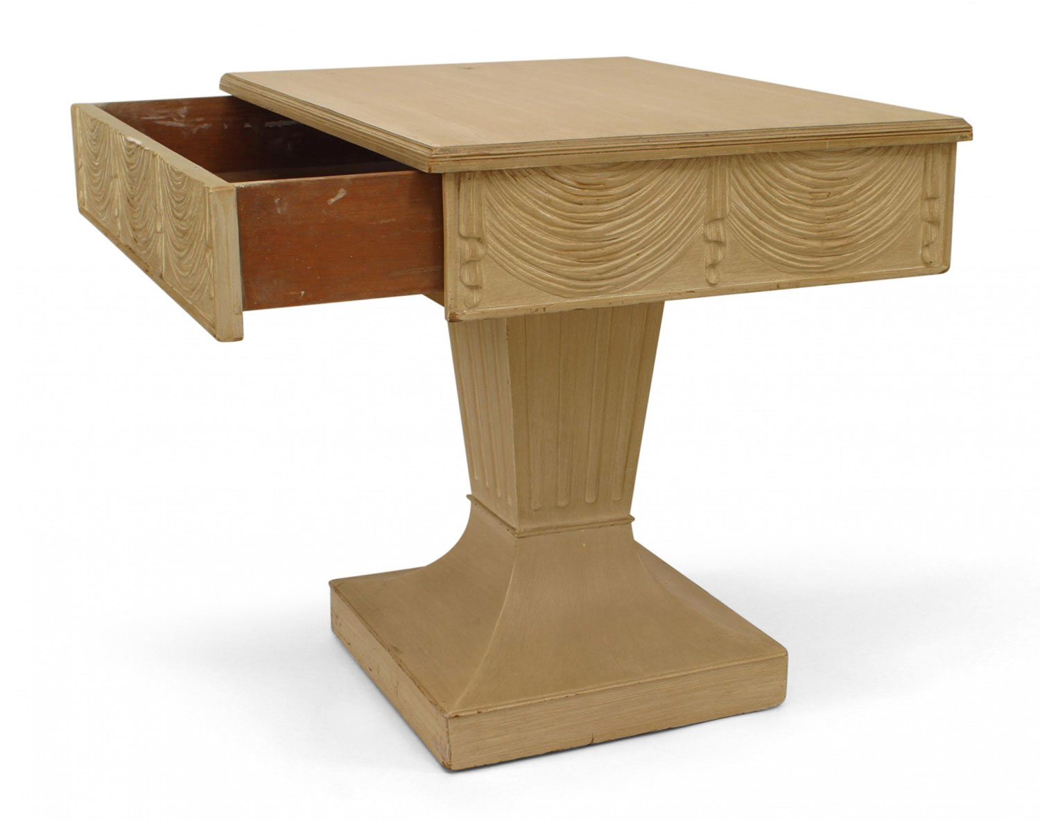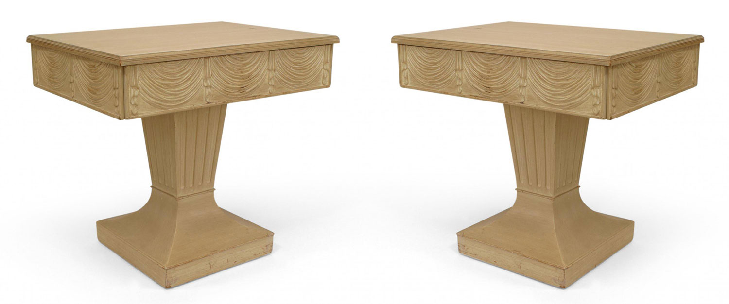 PAIR of American Art Moderne bleached end tables with swag carved design on 3 sides and a drawer supported on a square fluted pedestal base. (Attributed to GROSFELD HOUSE) (PRICED AS PAIR).