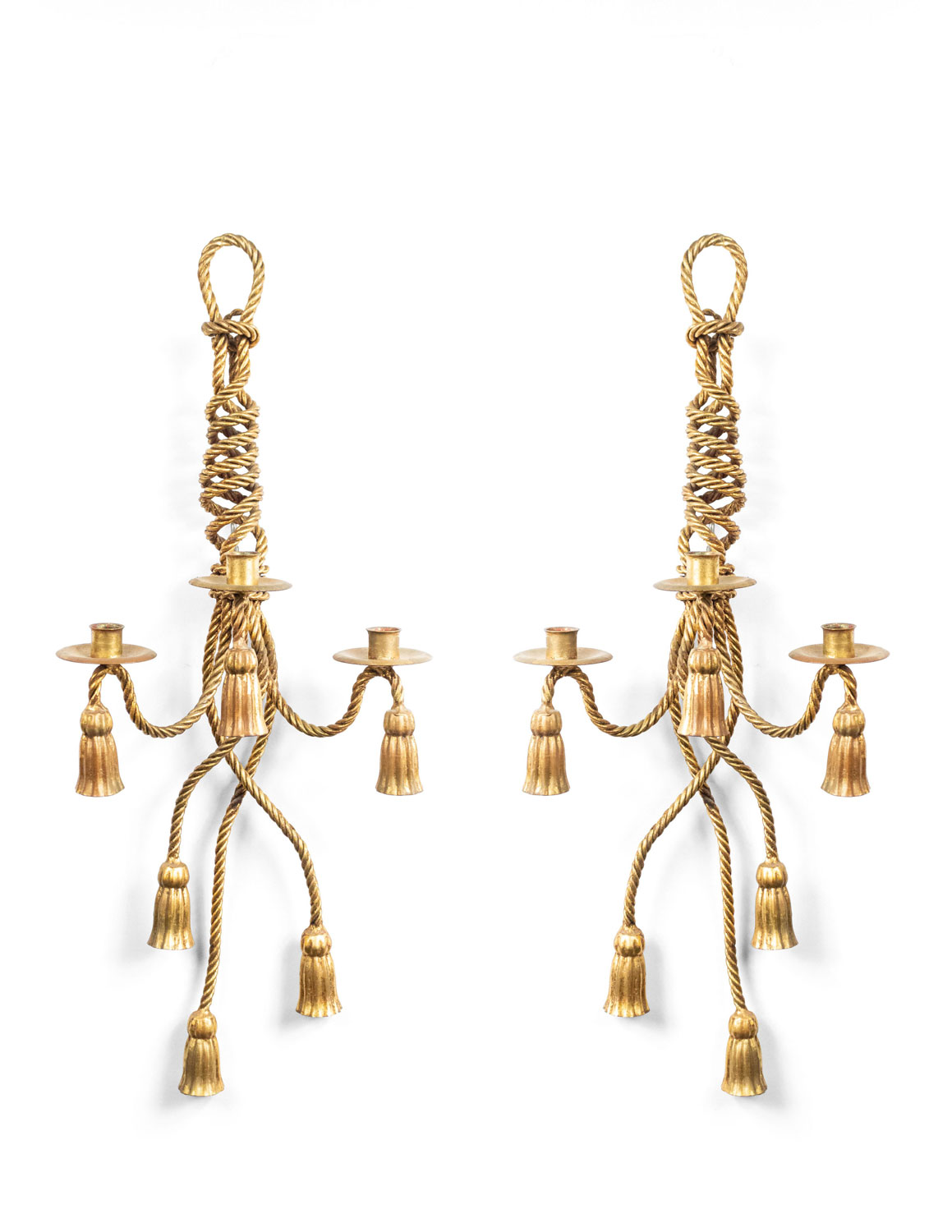 PAIR of Mid-Century Art Moderne Rope and Tassel design gilt metal wall sconces with three arms, narrow profile, and coiled tops. (PRICED AS PAIR).