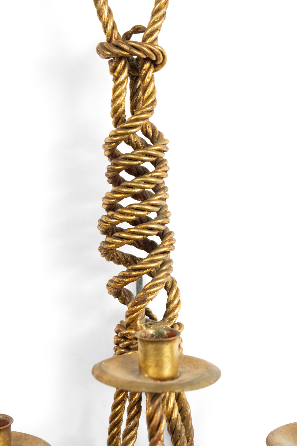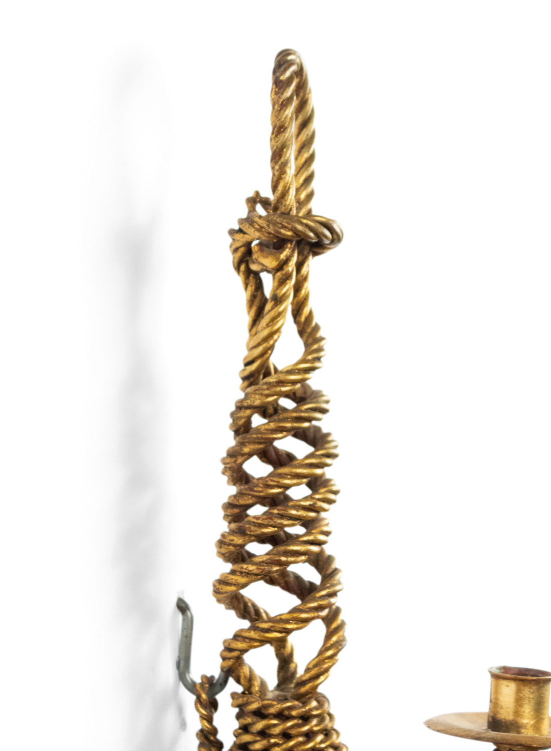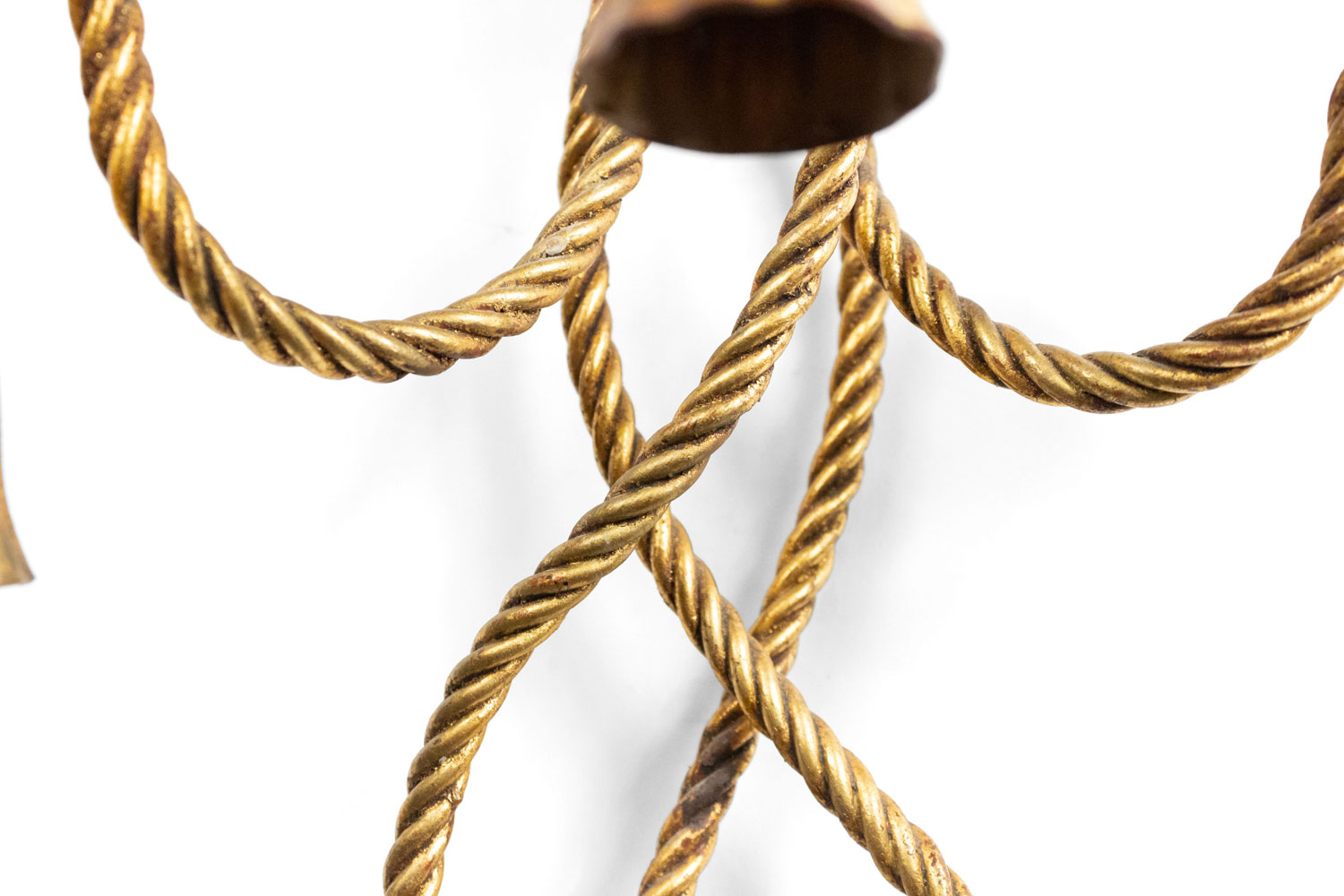 PAIR of Mid-Century Art Moderne Rope and Tassel design gilt metal wall sconces with three arms, narrow profile, and coiled tops. (PRICED AS PAIR)