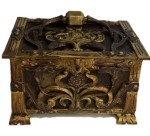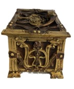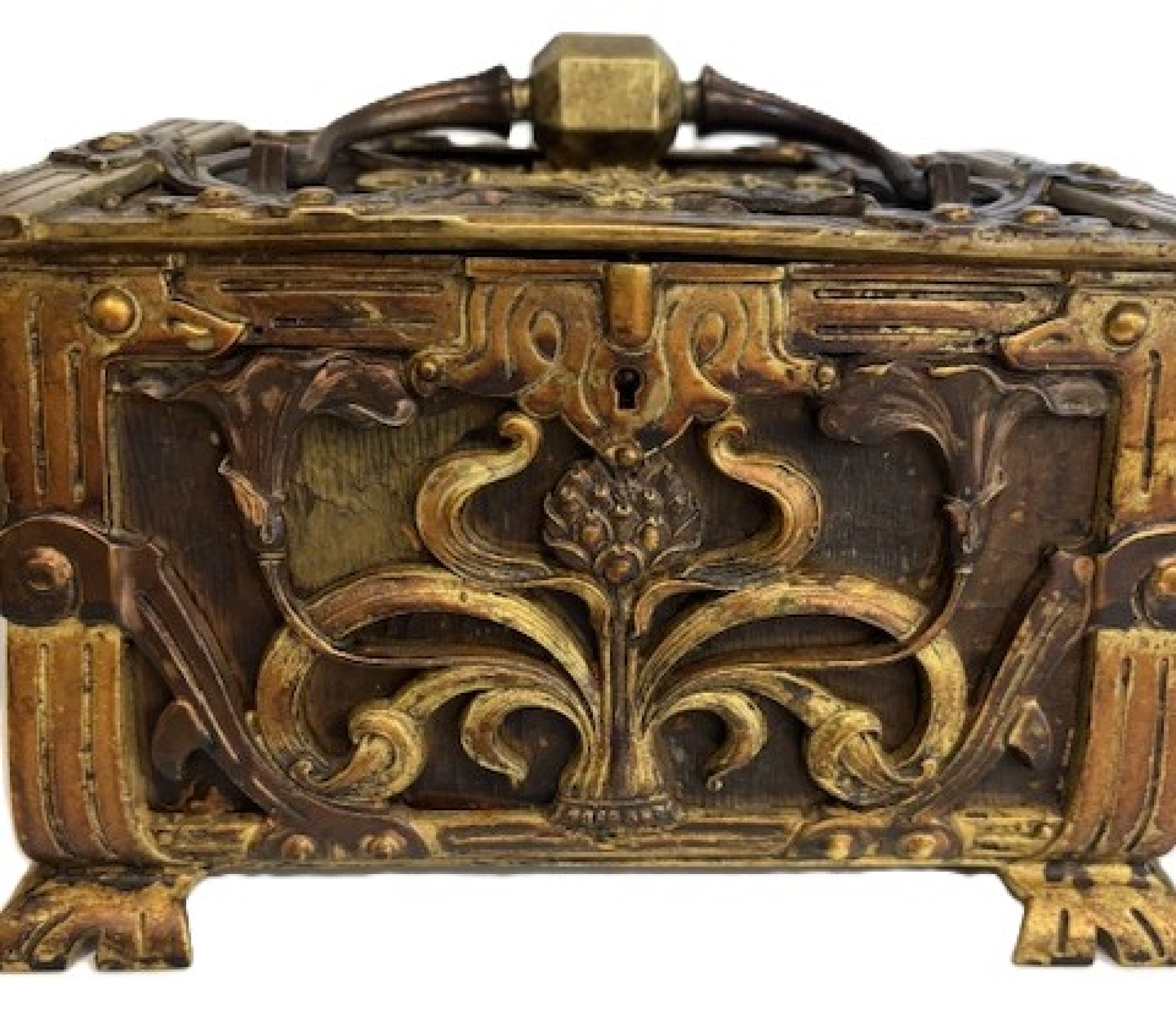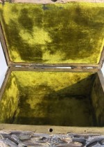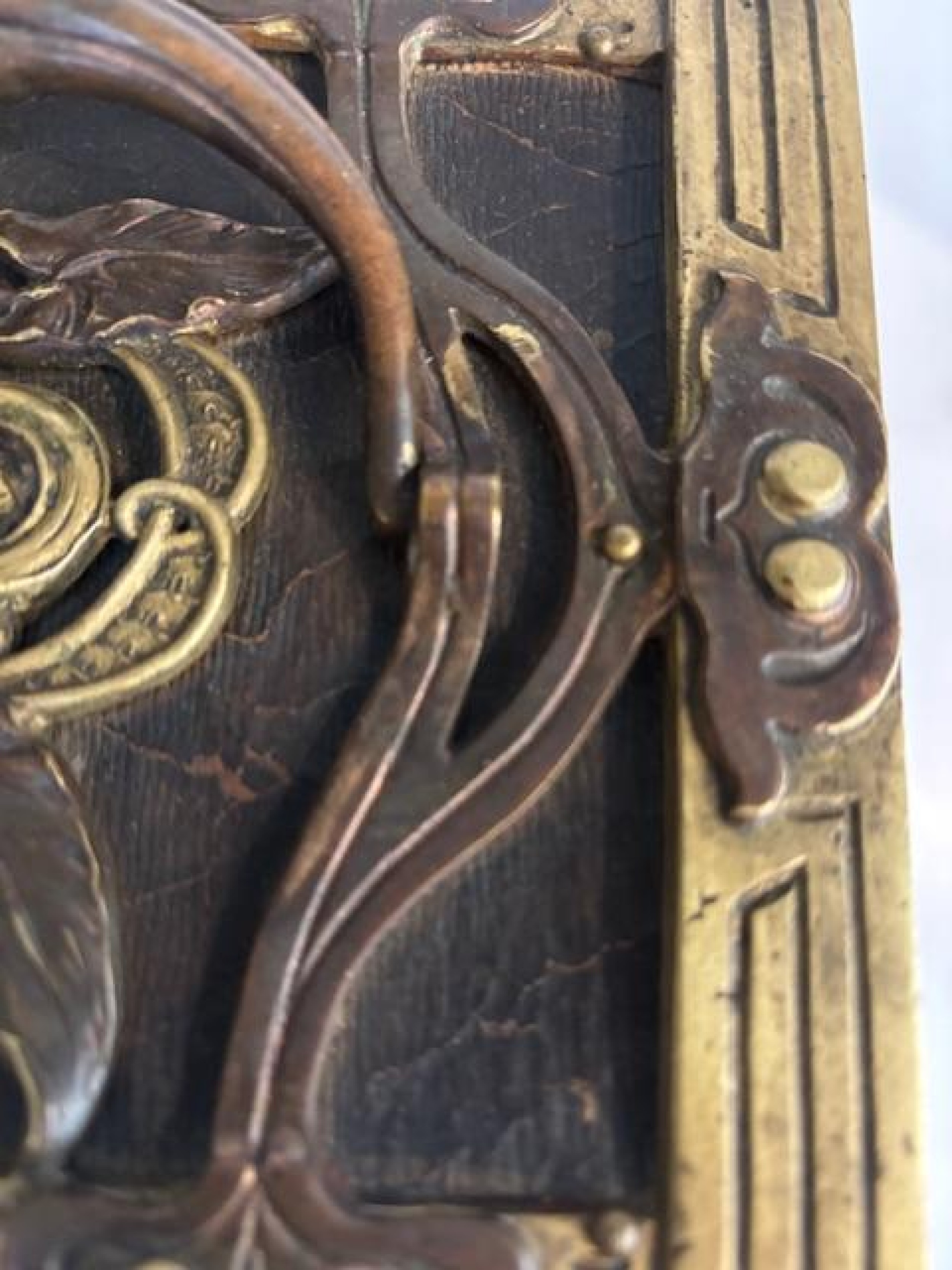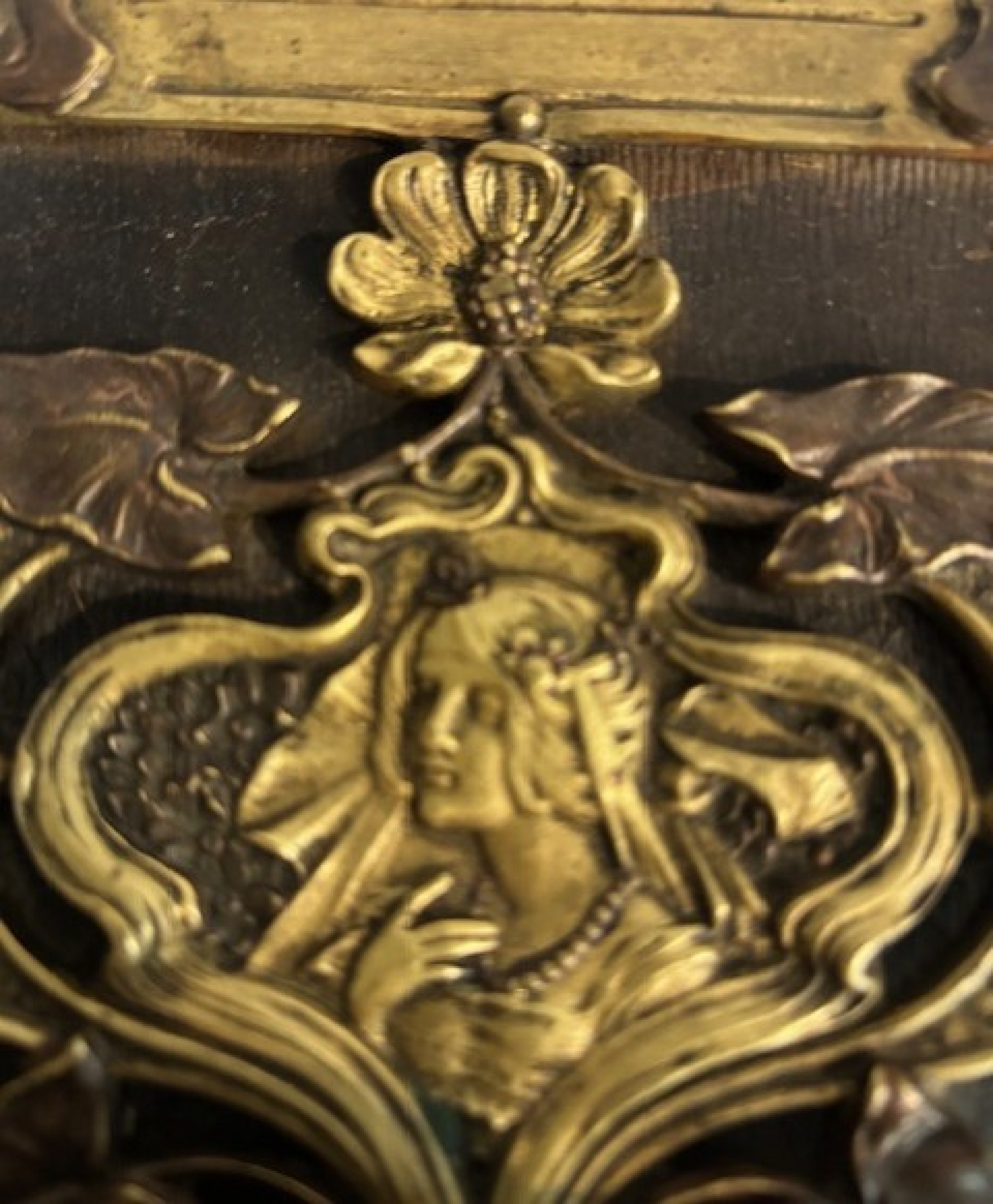 Art Nouveau brass and copper framed box over embossed paper having a floral whiplash design and head of lady with a green velvet interior