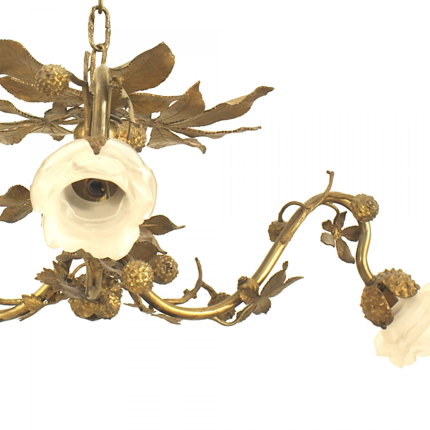 Art Nouveau-style gilt metal rustic style chandelier with 3 arms having design of leaves and berries with 3 frosted glass flower shades..