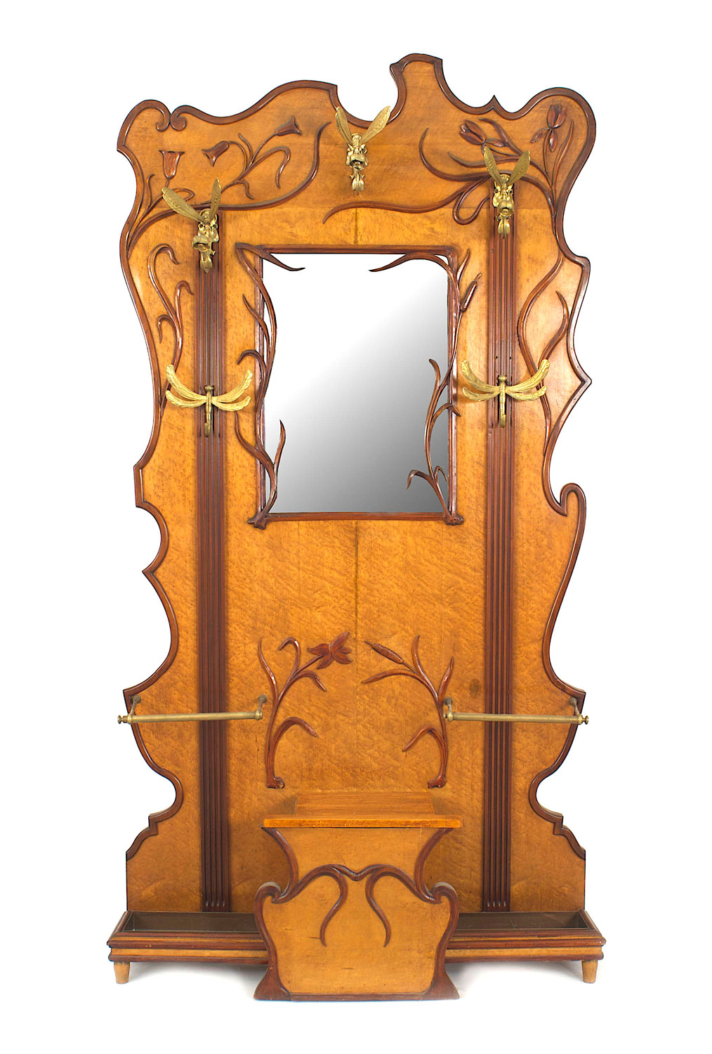 French Art Nouveau walnut and maple hatrack with a large center mirror having whiplash carving and 5 gilt bronze firefly coat hooks and lower umbrella stand with 2 brass rails.