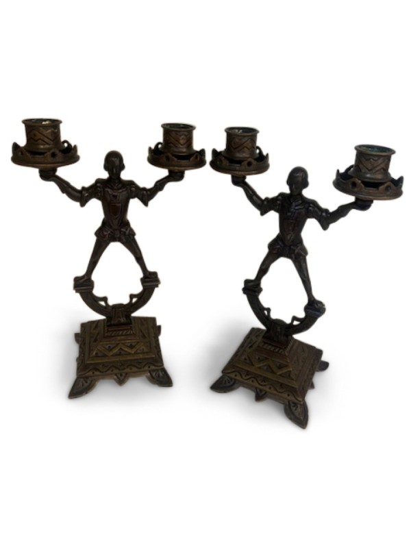 Pair of Arts and Crafts Brass Gnomes and Dwarves Embellished Candlesticks