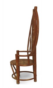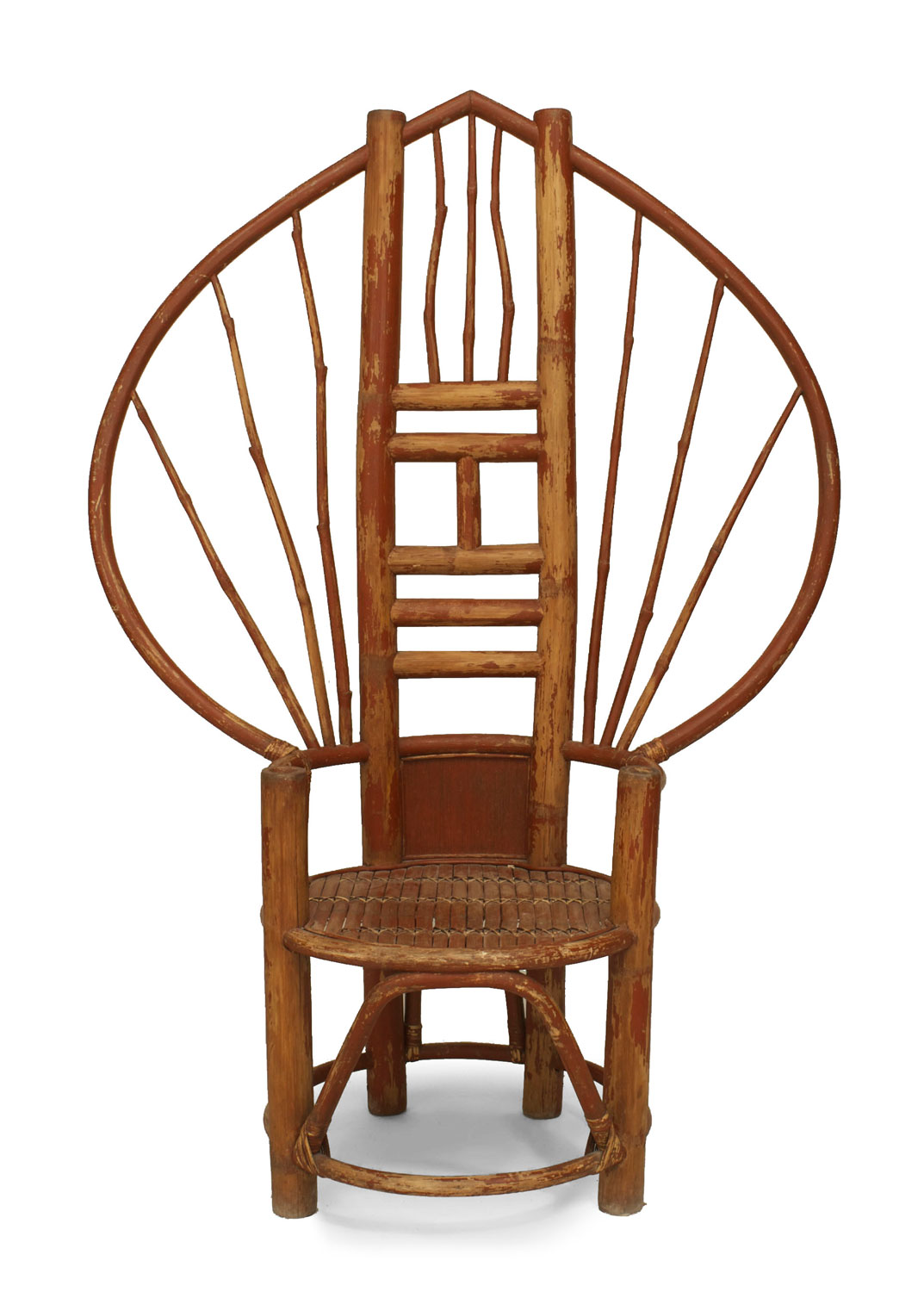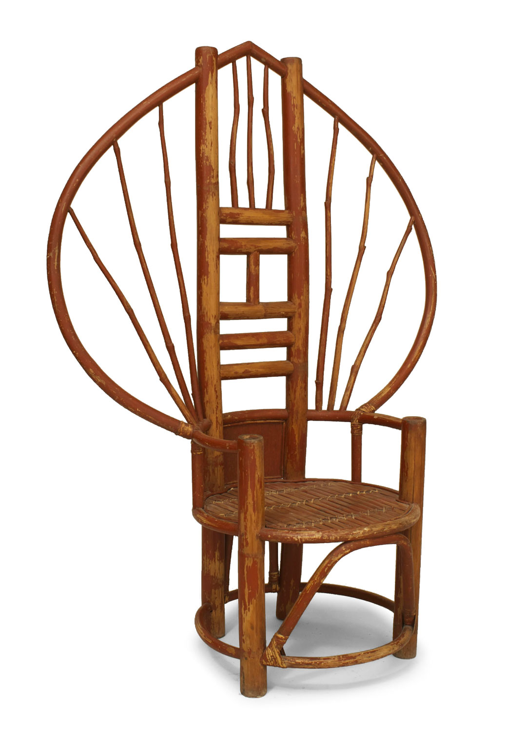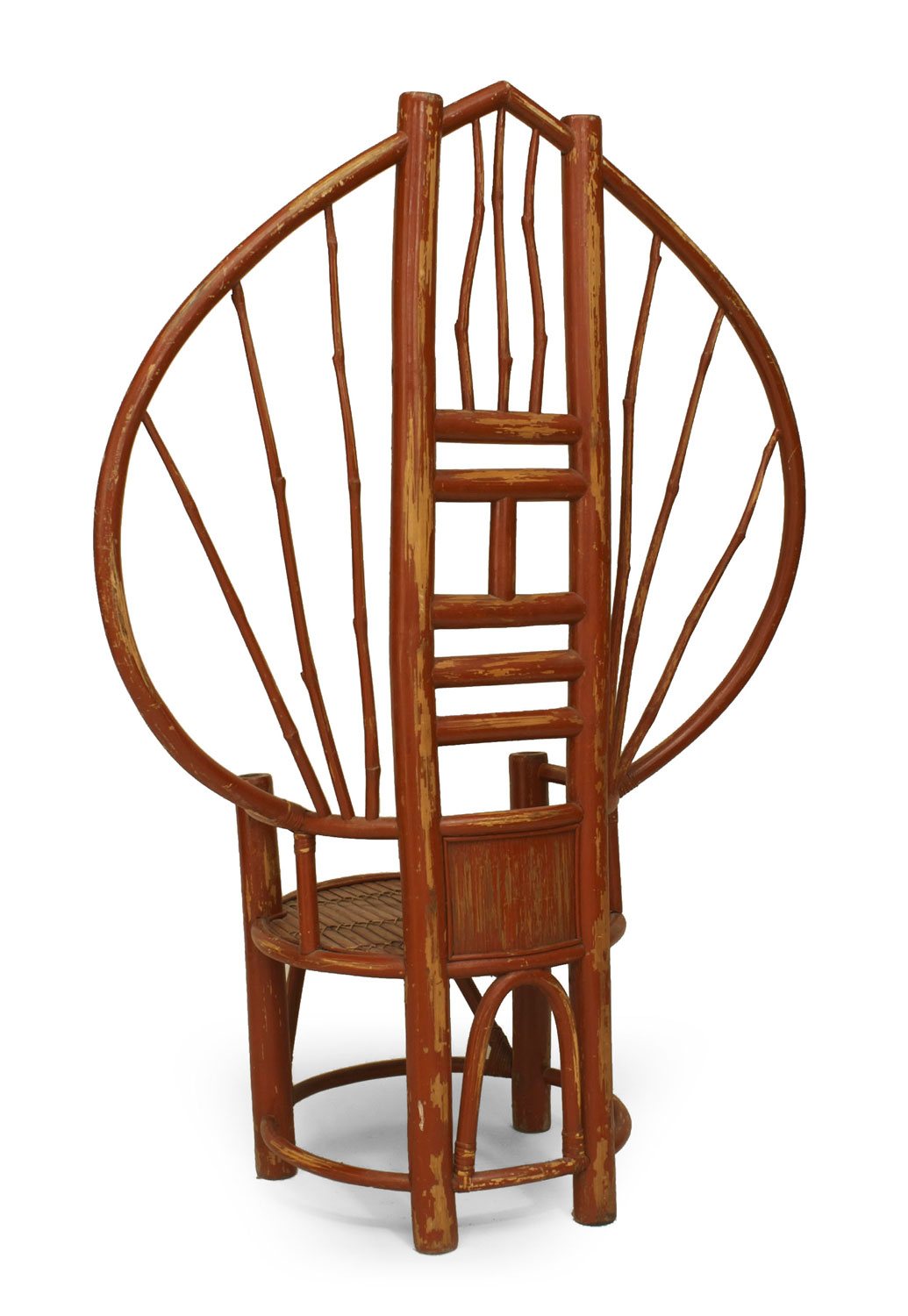 Asian (possibly Japanese) bamboo fan back throne chair with a rough red painted finish and round seat with a slat and woven design