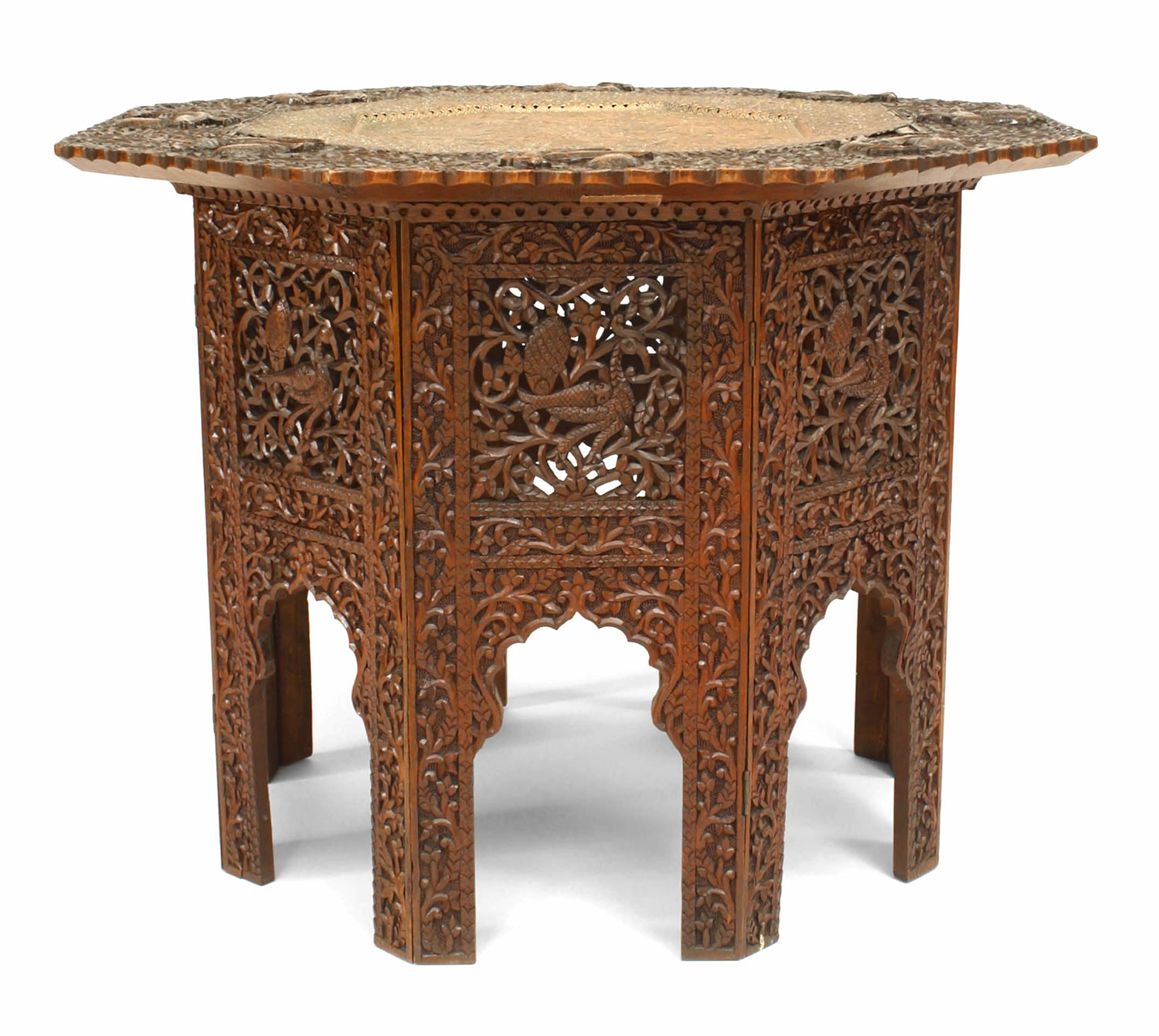 Asian Burmese-style (19th Century) walnut carved filigree octagonal table with floral and bird design and scalloped edge with inset copper tray top