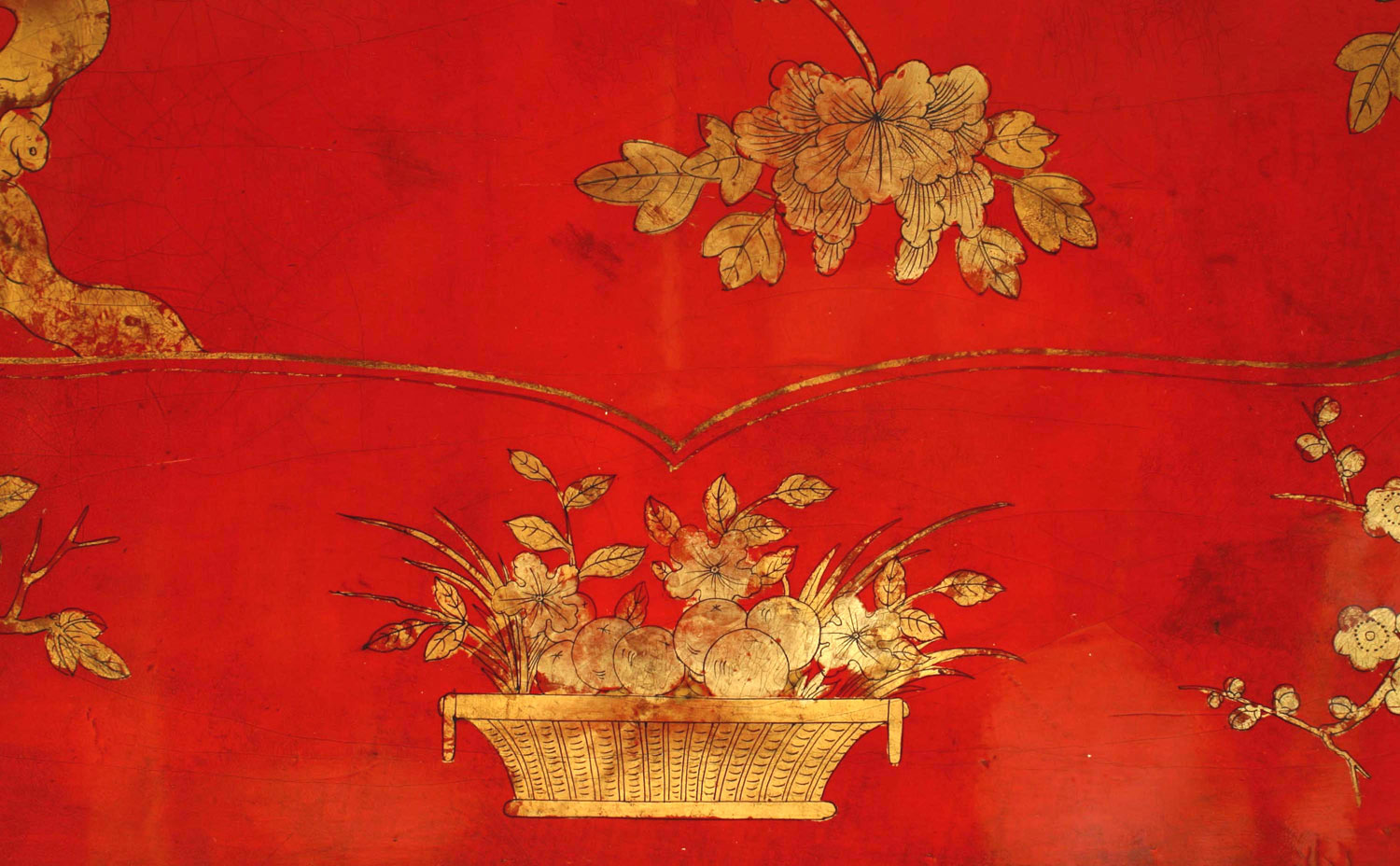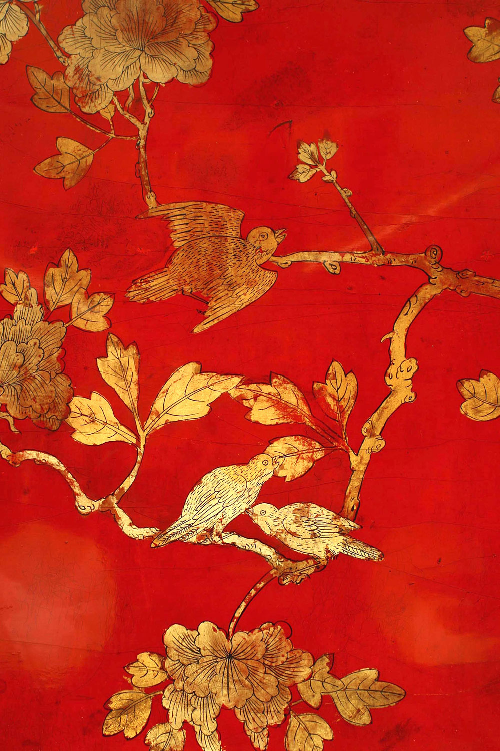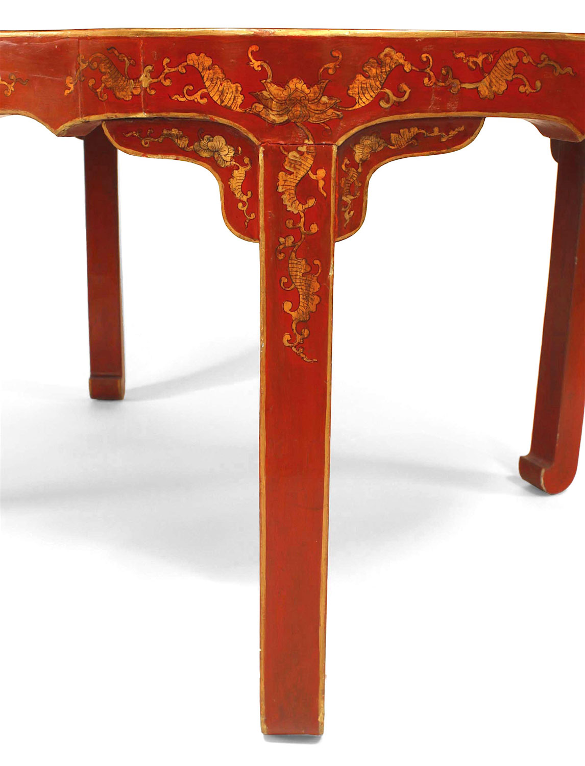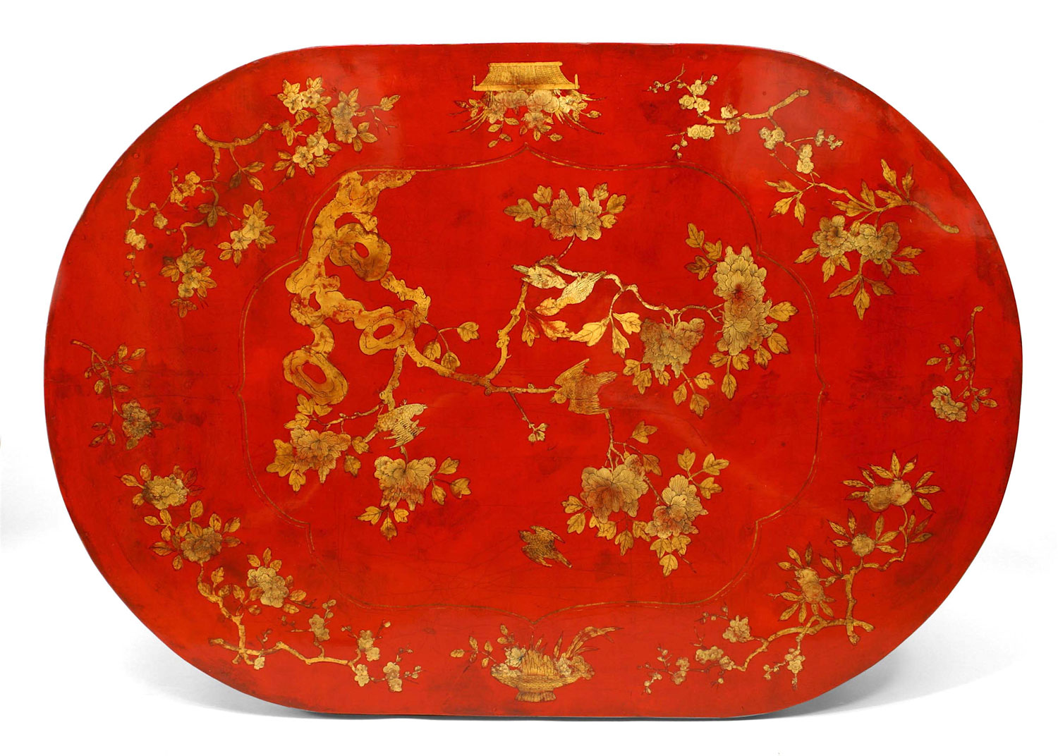 Asian Chinese (19th Century) oval red lacquer and gilt stencilled center table with floral and bird design (Related Item: 050151).