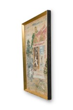 Thai Mythological painting depicting a noble woman in her retreat making an offering in a gold and black frame.
