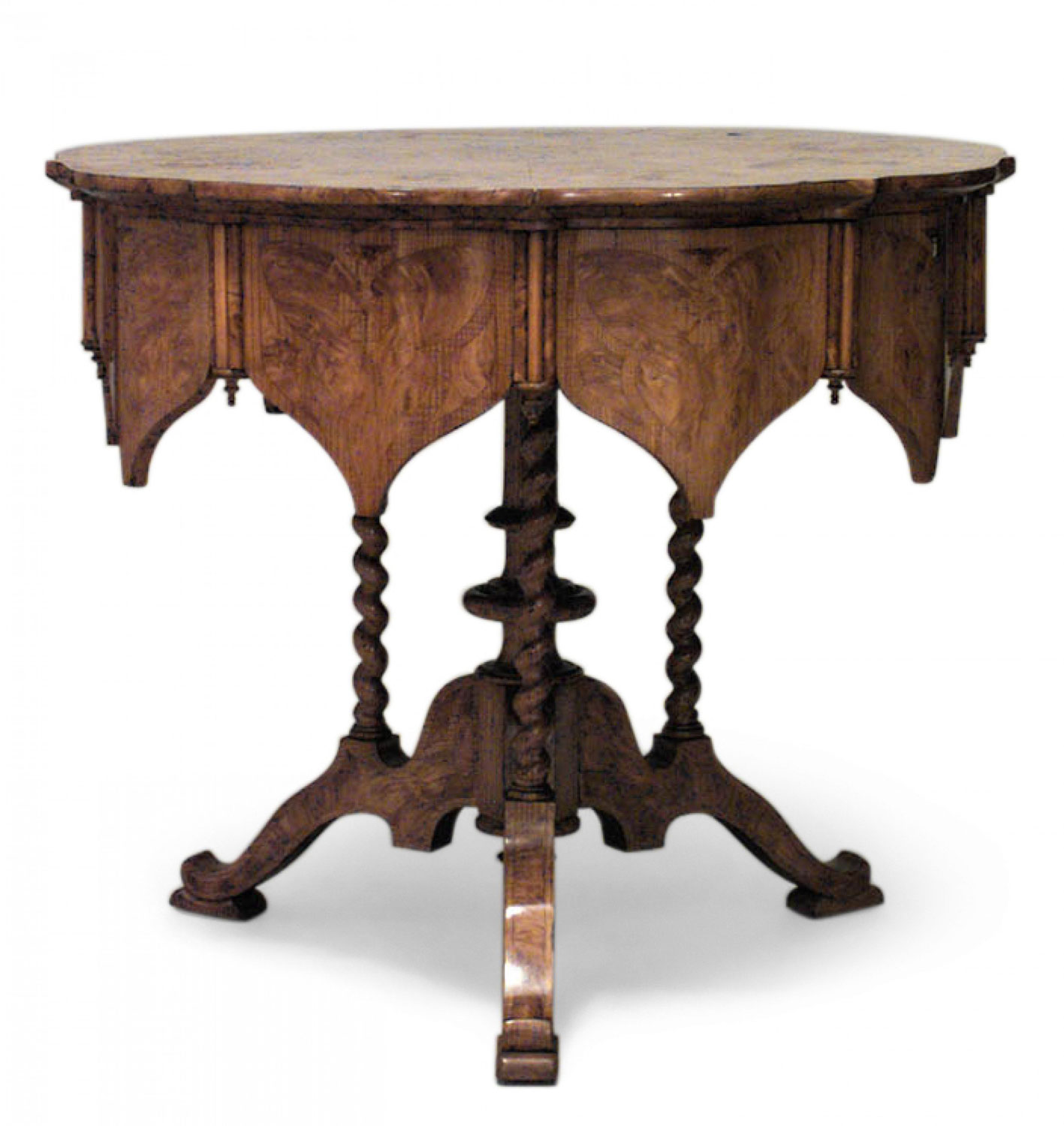 Austrian Biedermeier (Circa 1840) burl ash and inlaid round table with Gothic design apron and spool supports..