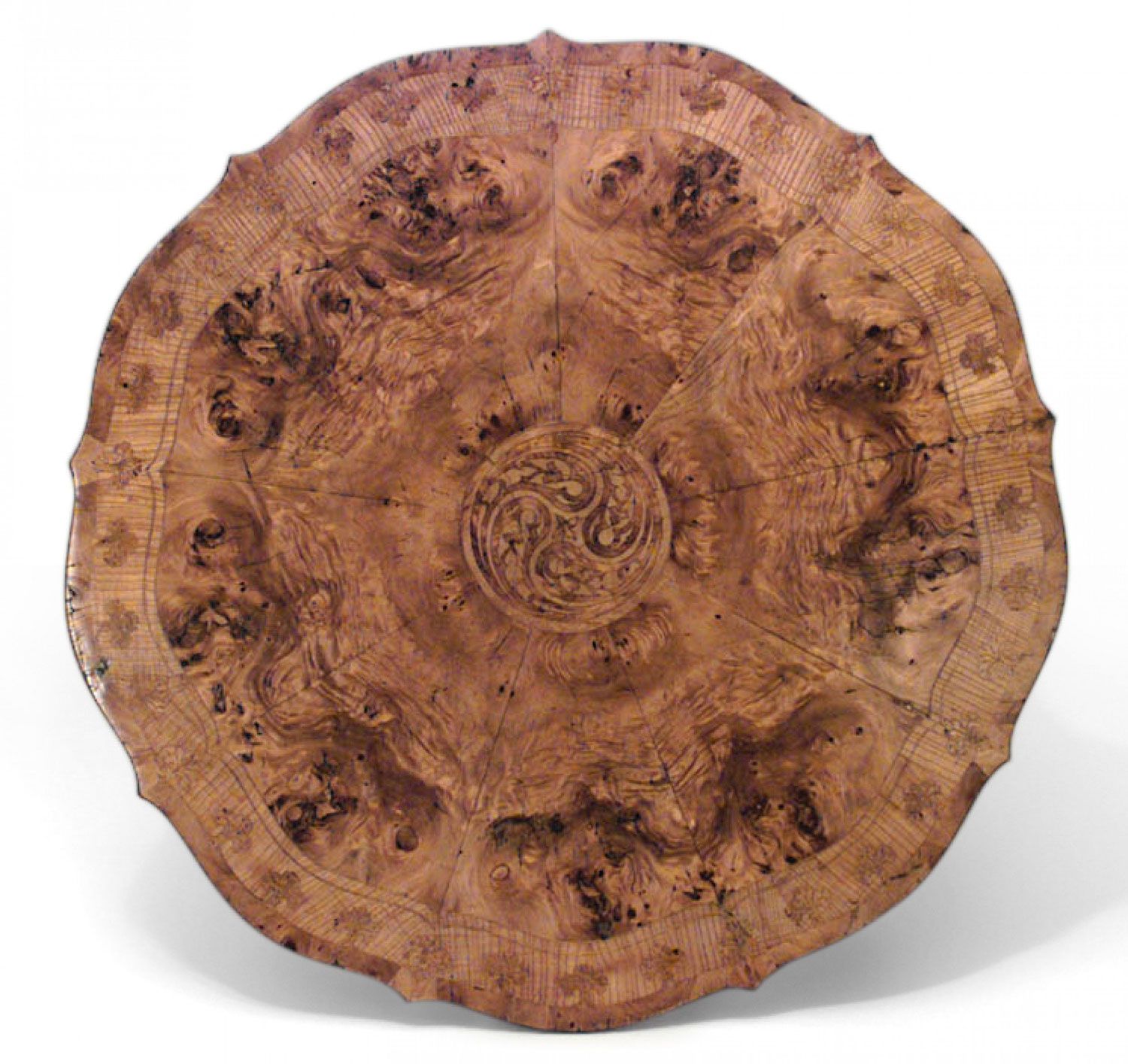 Austrian Biedermeier (Circa 1840) burl ash and inlaid round table with Gothic design apron and spool supports.