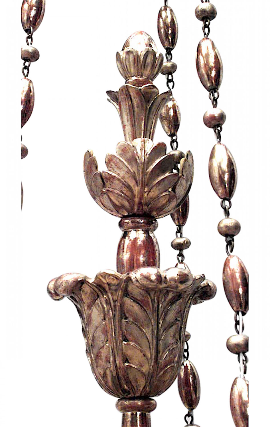 Austrian Biedermeier (Circa 1820) gilt carved chandelier with 6 Neo-classical torch design arms with carved 3 tier center post and carved feathers on canopy with finial bottom