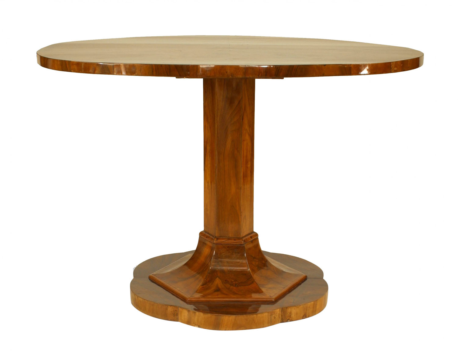 Austrian Biedermeier (circa 1820) round tilt top center table with walnut veneer on 6 sided pedestal base supported on scalloped platform. Finished under top..