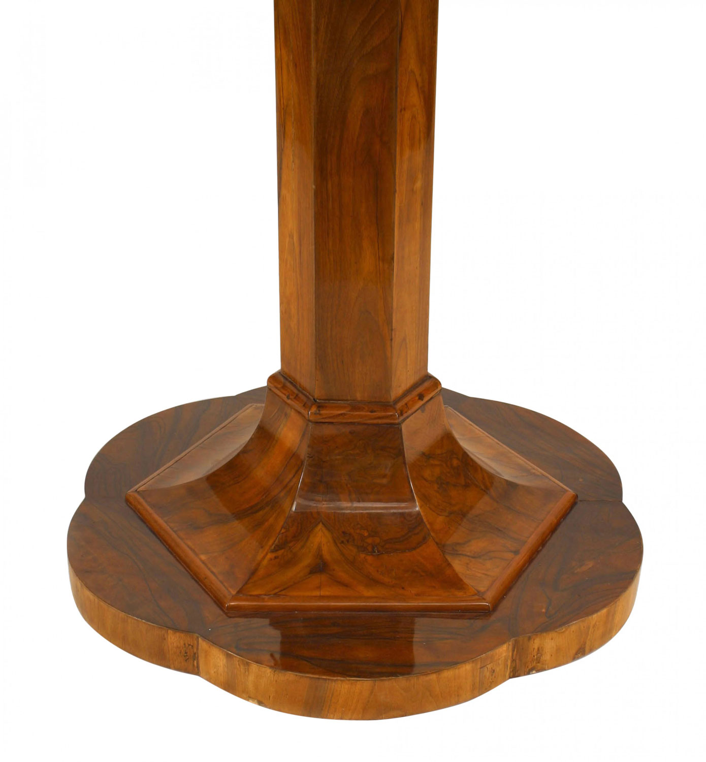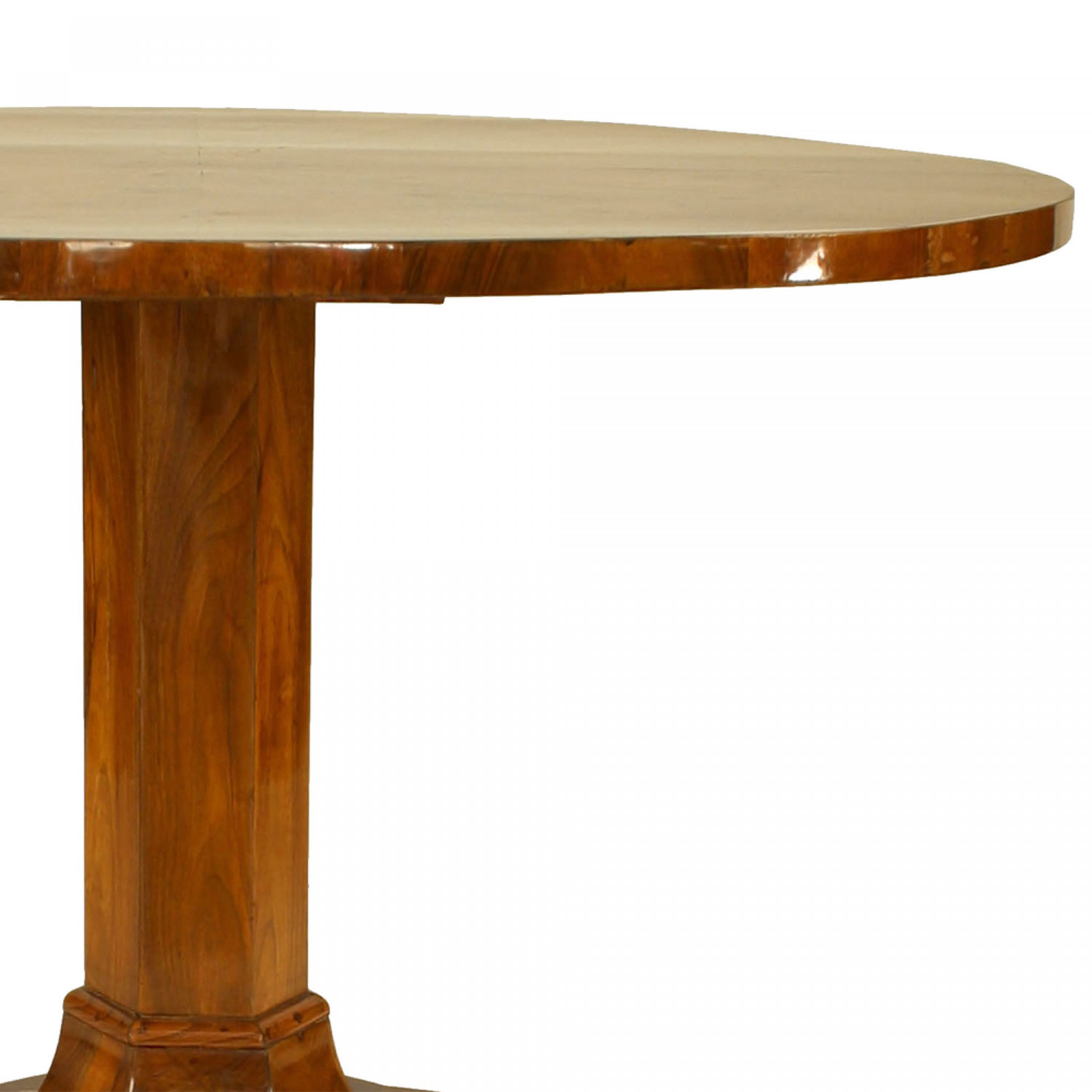 Austrian Biedermeier (circa 1820) round tilt top center table with walnut veneer on 6 sided pedestal base supported on scalloped platform. Finished under top.