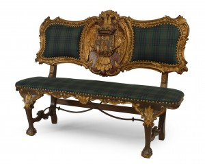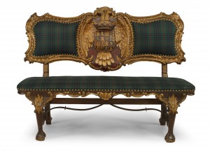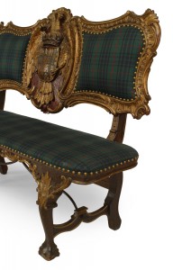 Austrian Hungarian (19th Cent) walnut and gilt trimmed loveseat with a back featuring a double eagle head crest between 2 upholstered panels and wrought iron stretcher