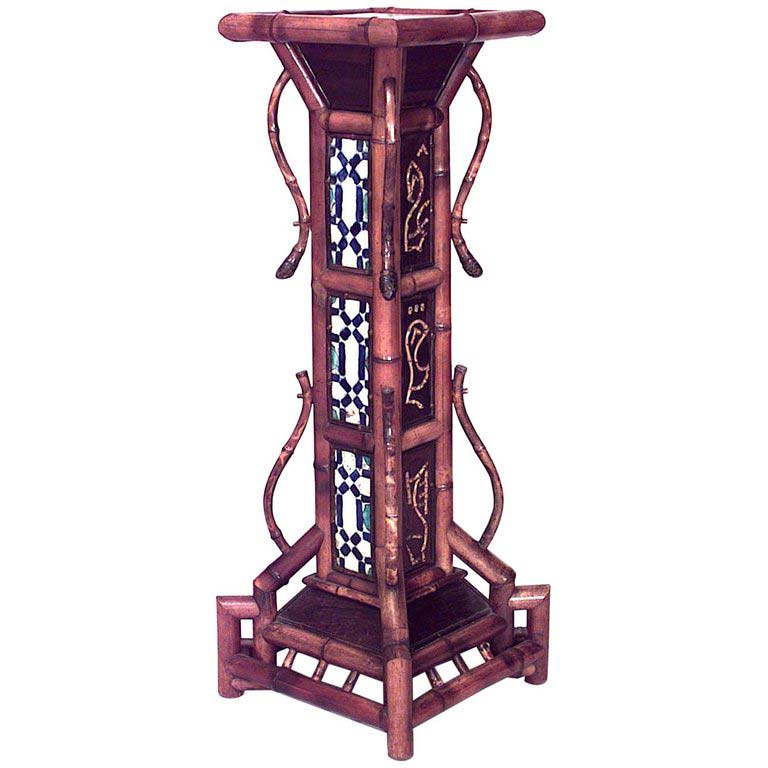 Bamboo (English Victorian) large square pedestal with blue and white porcelain panels..