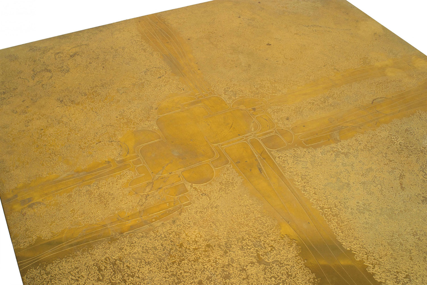 Belgian Modern design (1970s) square etched brass coffee table with a centered "X" design on a solid ebonized base. (GEORGE MATHIAS).