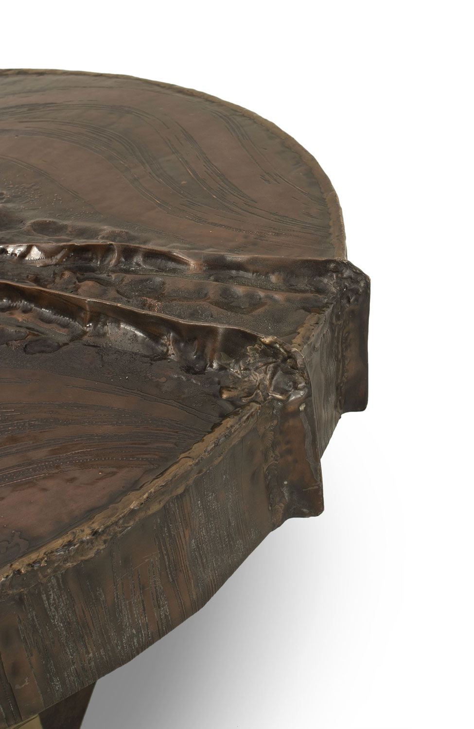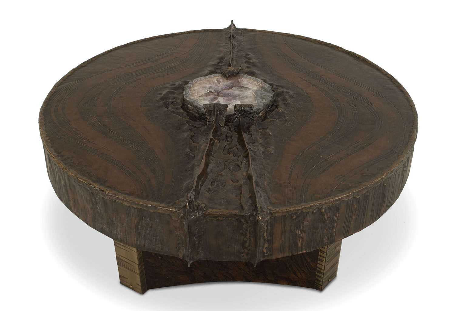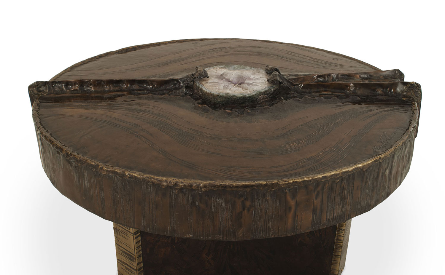 Belgian Modern design round sculptural cast copper coffee table with inset quartz stone on a copper and brass base (by MARC D'HAENS).