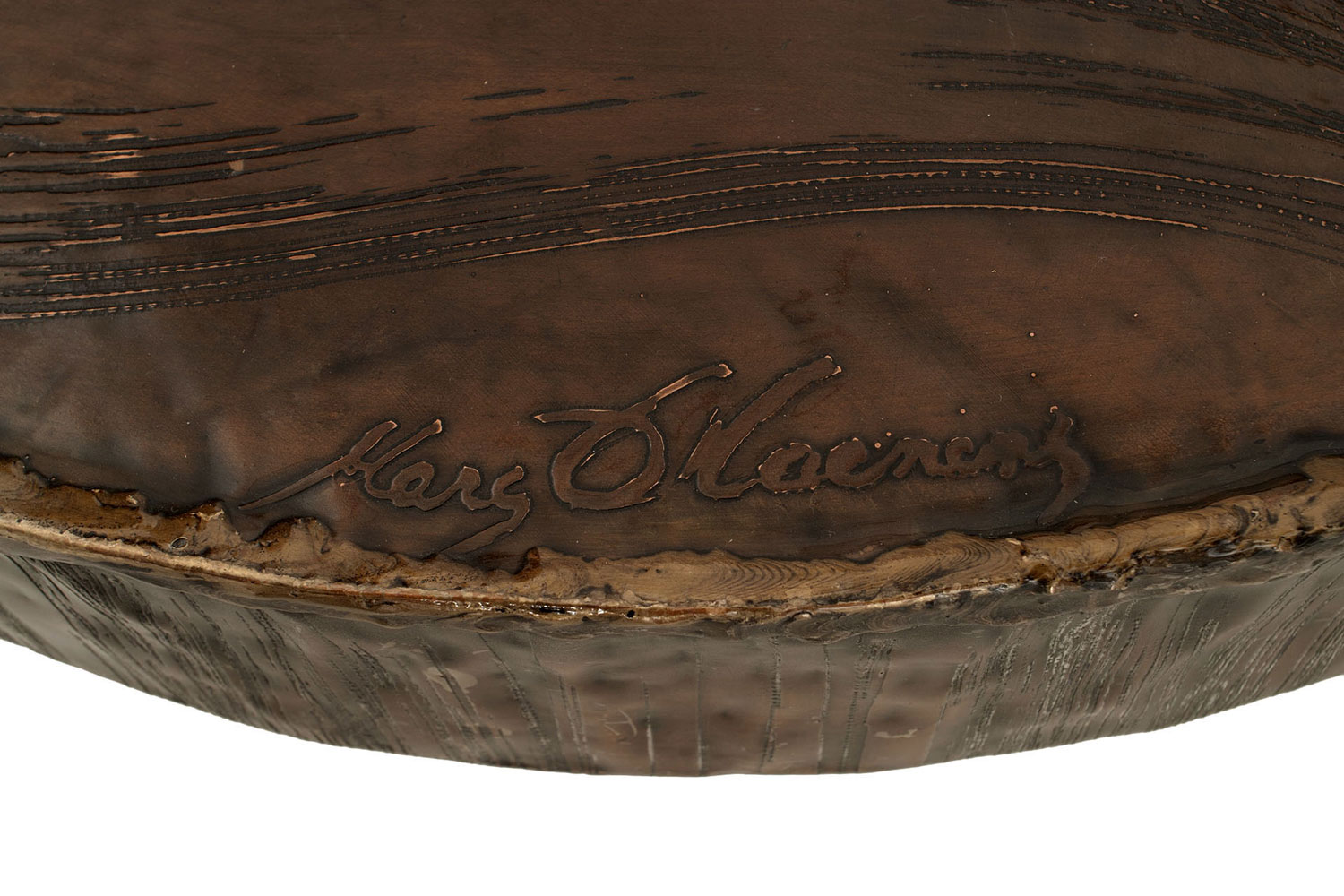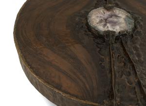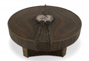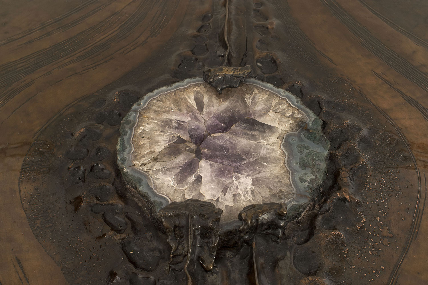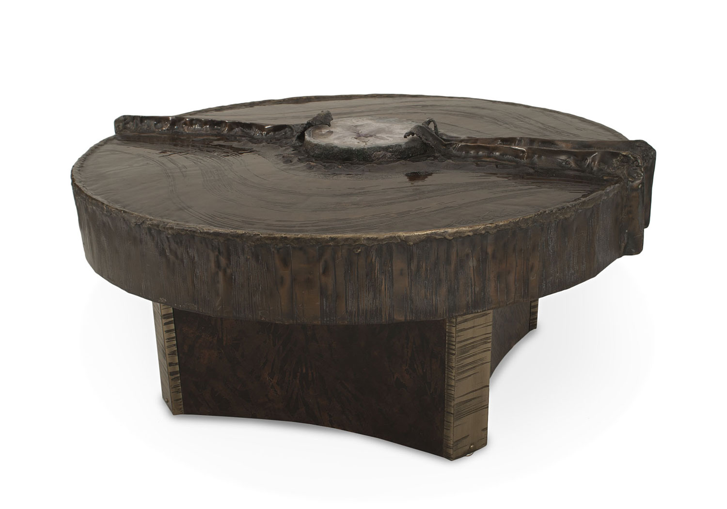 Belgian Modern design round sculptural cast copper coffee table with inset quartz stone on a copper and brass base (by MARC D'HAENS).