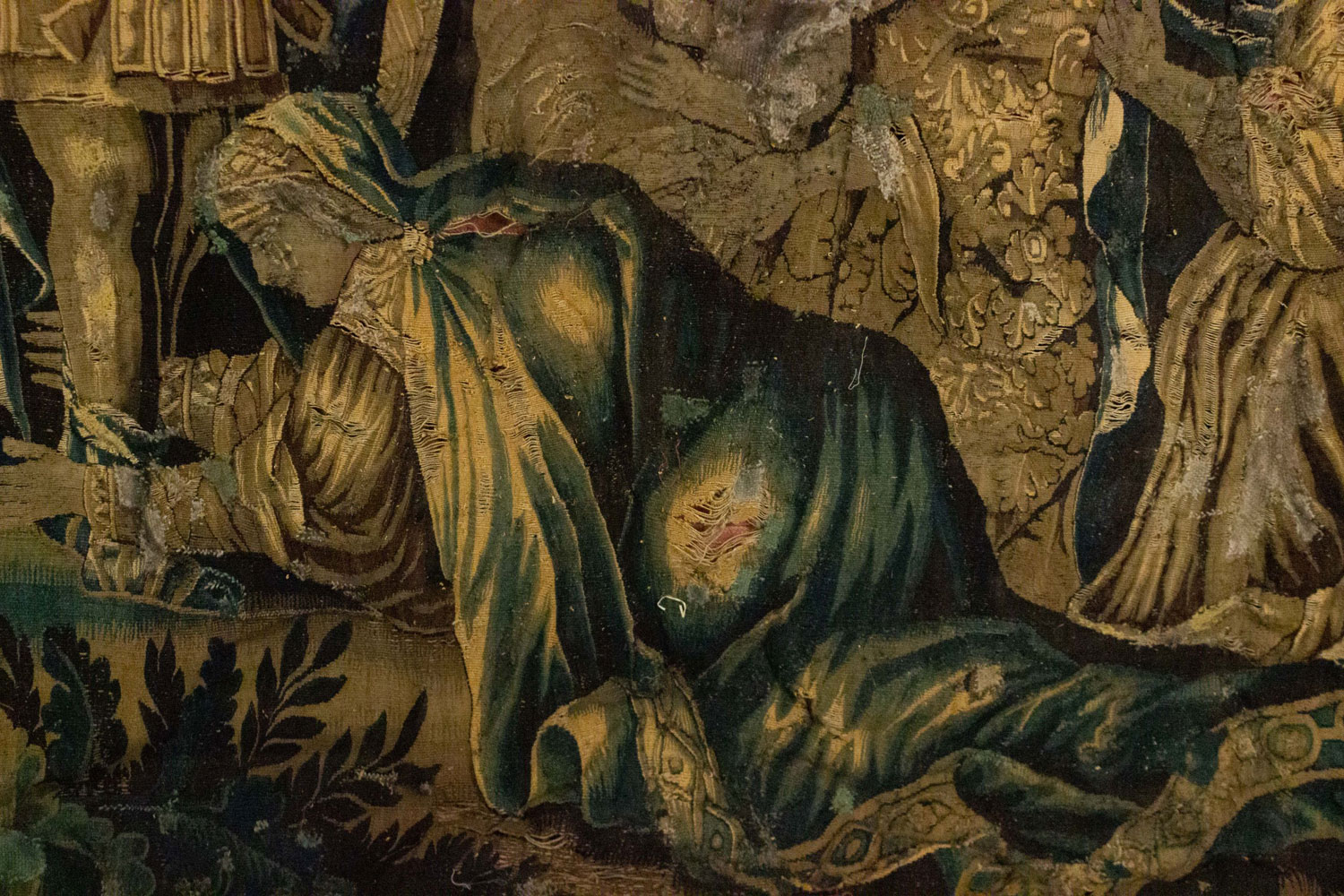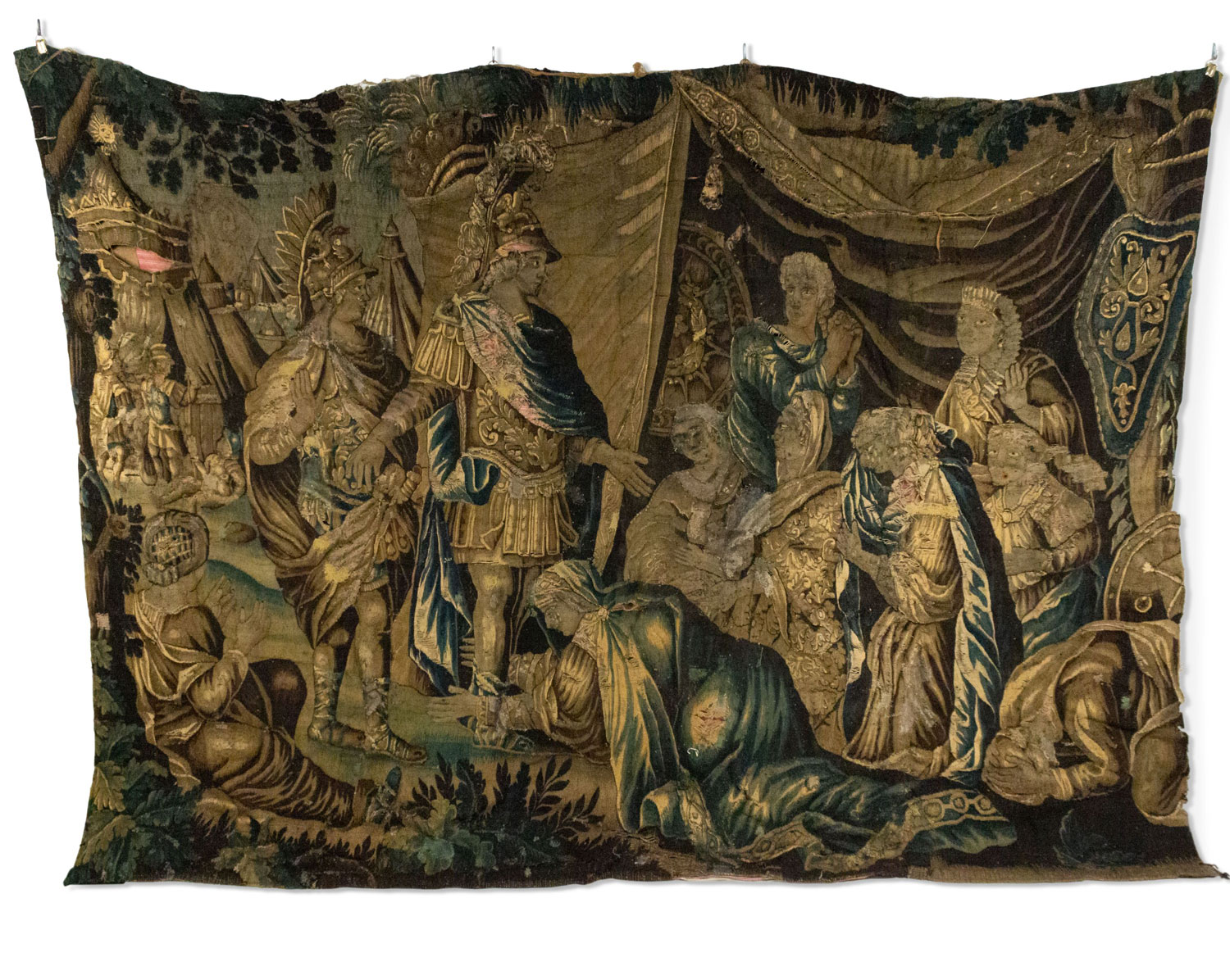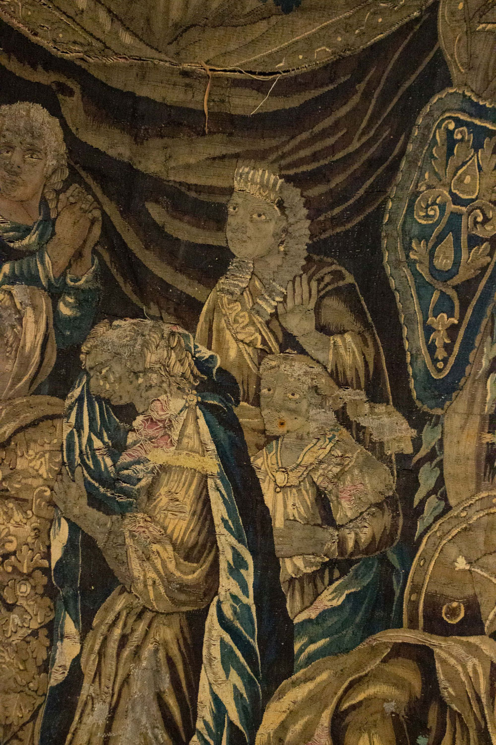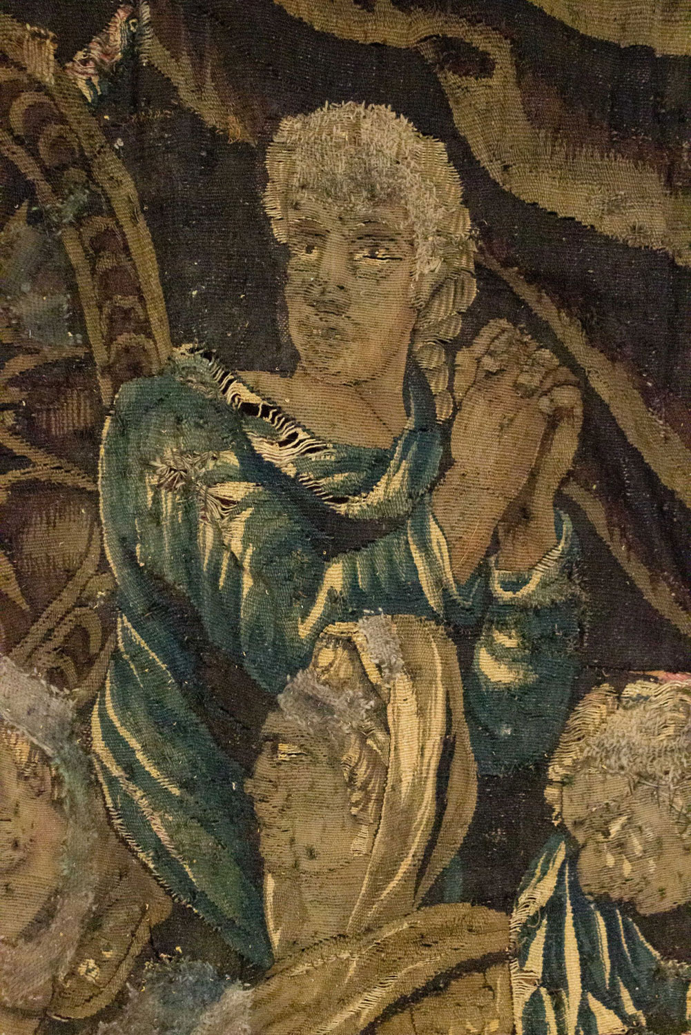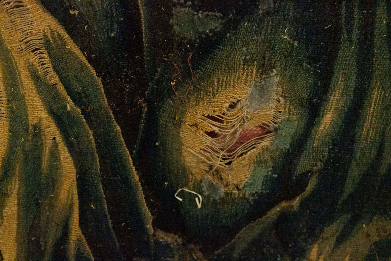 Style: Continental Materials & Techniques: Woven Category: Cleared Art, Rugs/Textile Condition: Tears in the tapestry. A few rings on the top to hang.