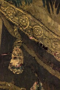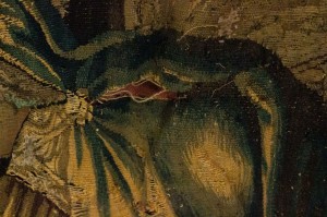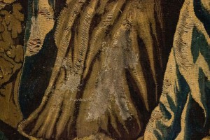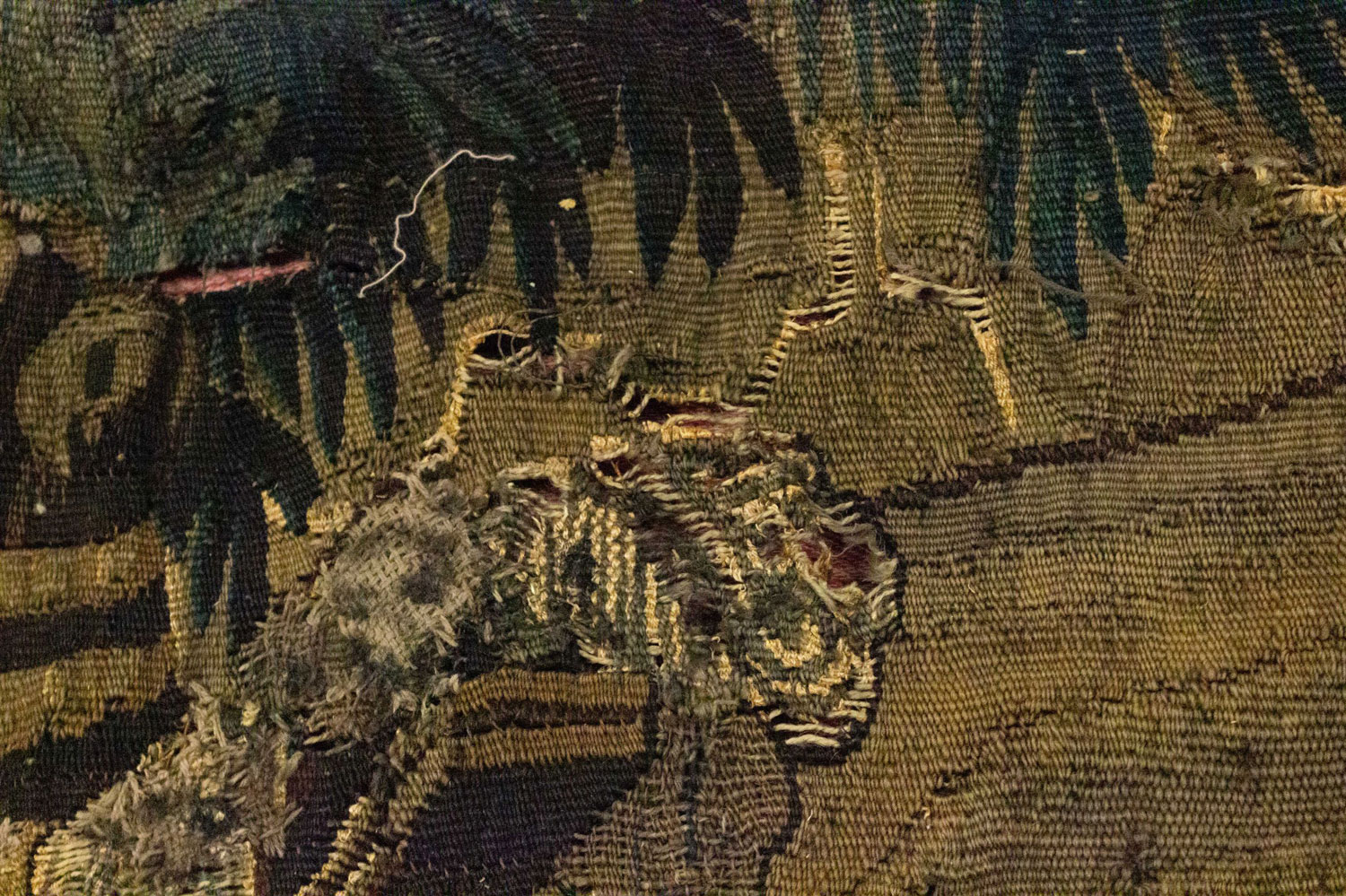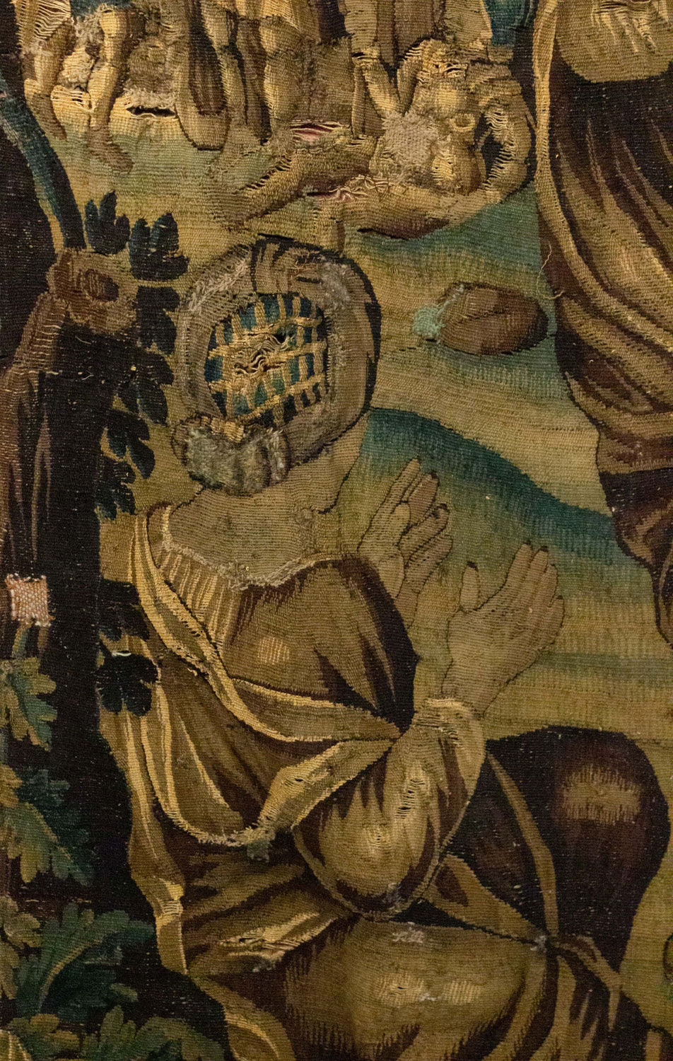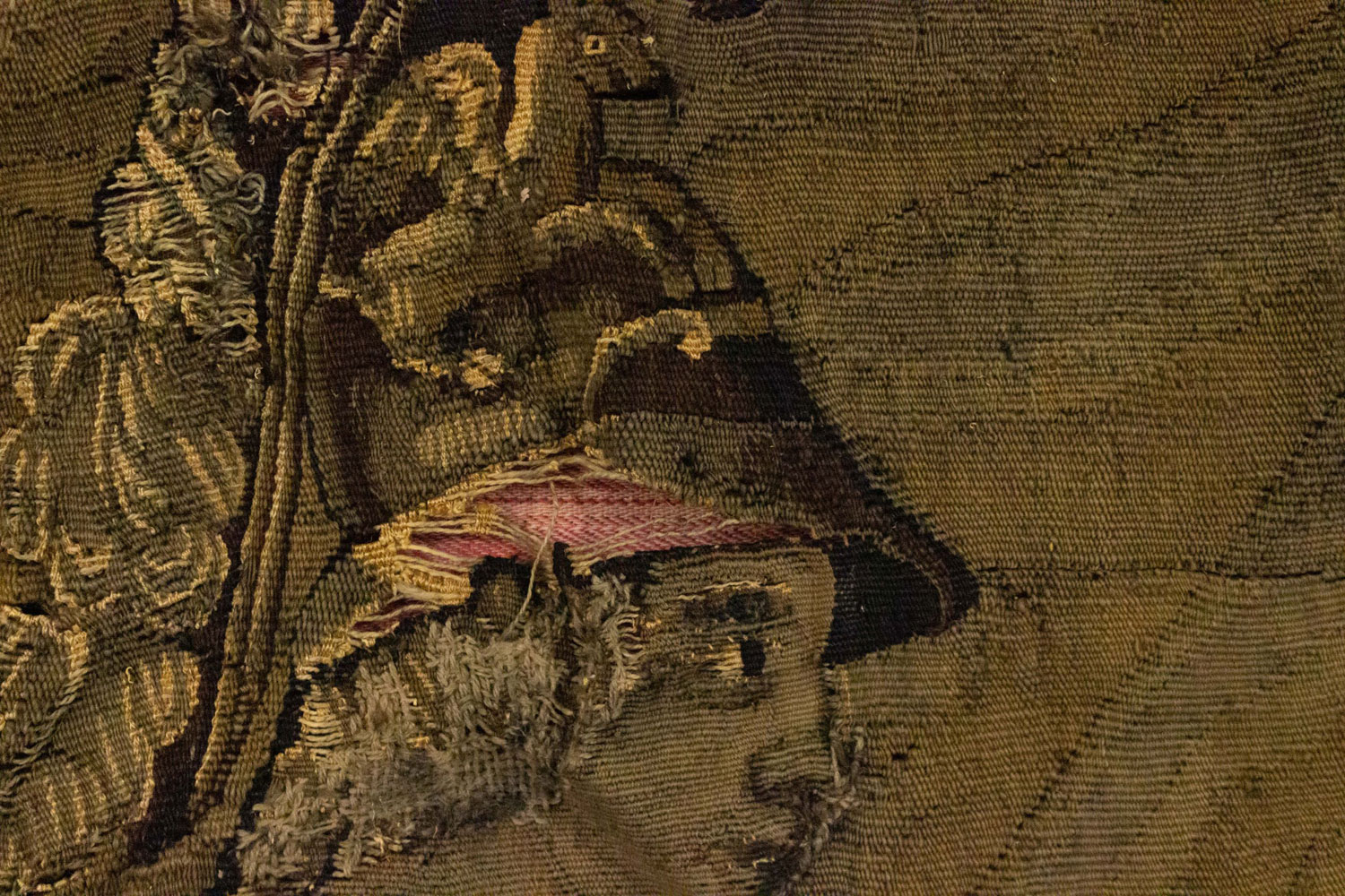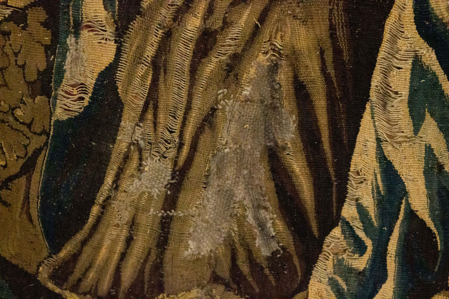 Style: Continental Materials & Techniques: Woven Category: Cleared Art, Rugs/Textile Condition: Tears in the tapestry. A few rings on the top to hang.