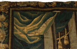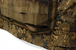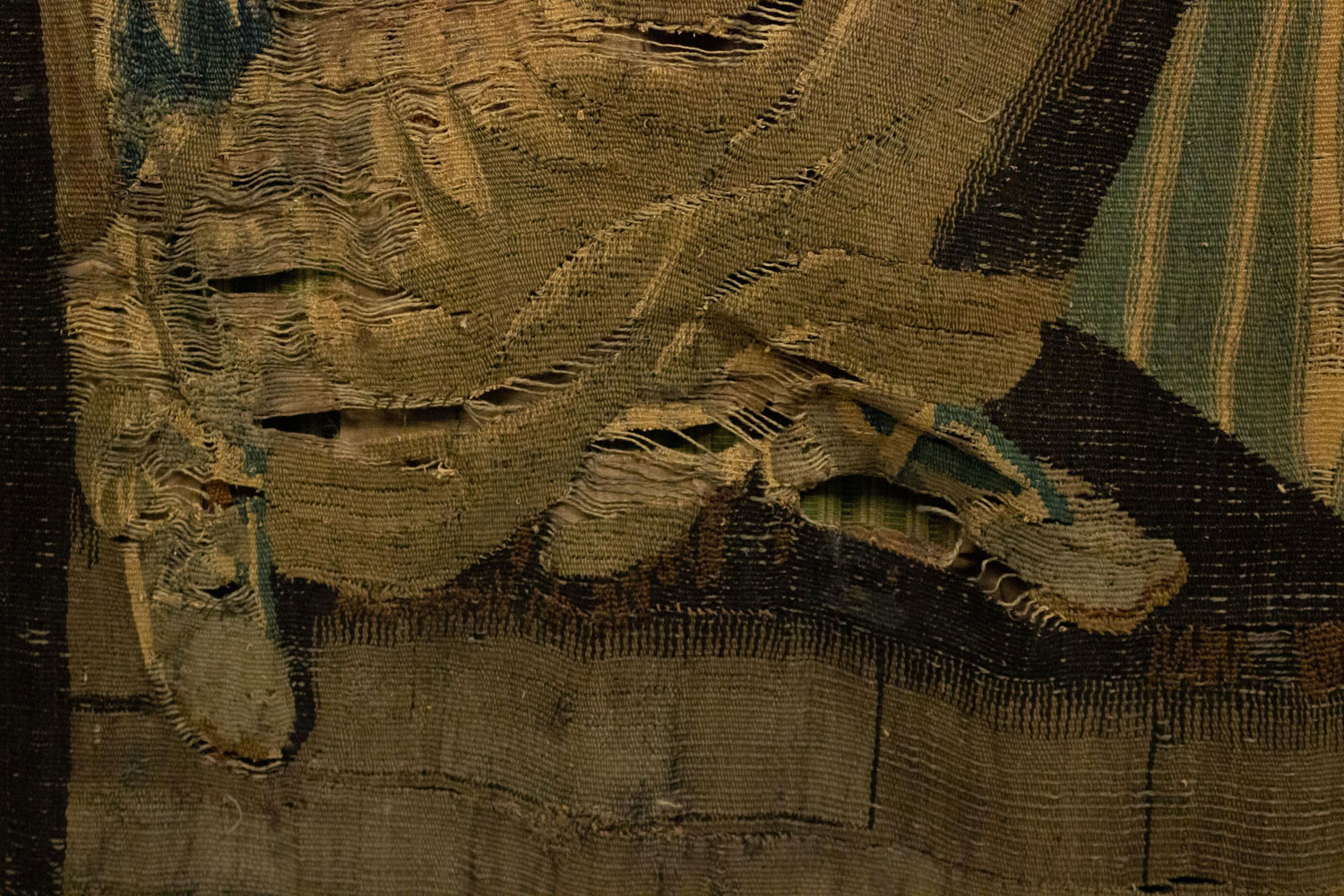 Style: Continental Materials & Techniques: Woven Category: Cleared Art, Rugs/Textile Condition: Tears in the tapestry. Hangs from a piece of wood on the top.